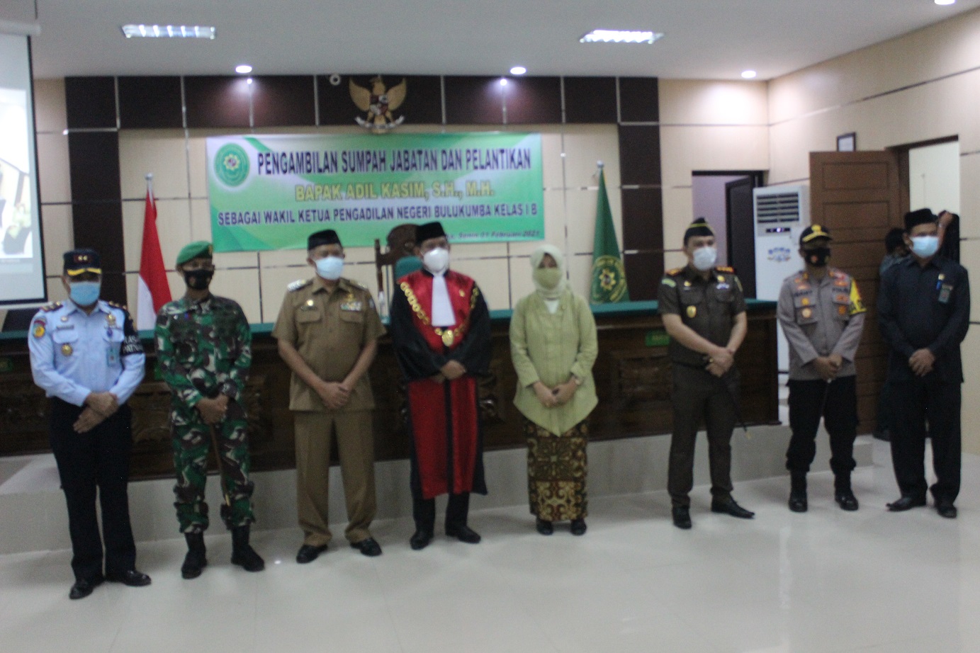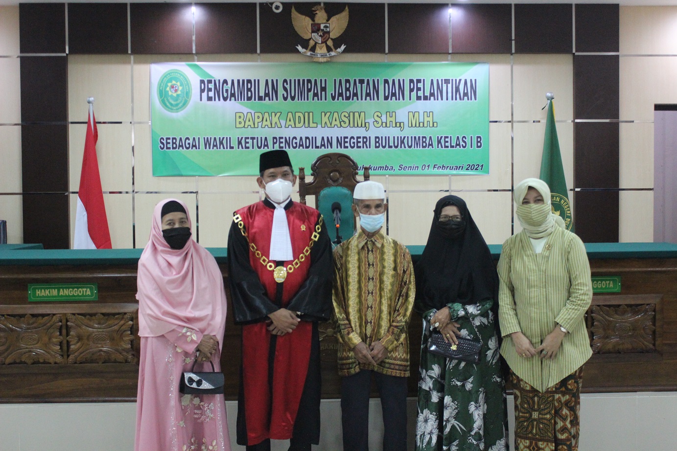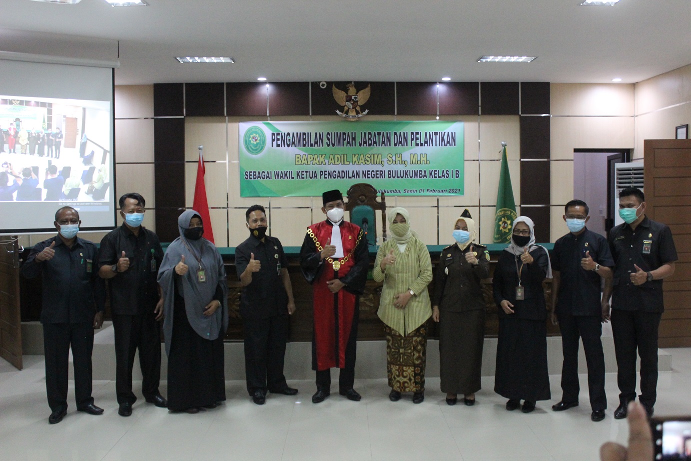 Bulukumba, Senin 01 Februari 2021 tepat pukul 10.00 WITA diruang Sidang Utama Kantor Pengadilan Negeri Bulukumba diselenggarakan acara Pengambilan Sumpah dan Pelantikan Wakil Ketua Pengadilan Negeri Bulukumba. Ketua Pengadilan Negeri Bulukumba, Bapak Khoiruman Pandu K. Harahap, SH, MH mengambil sumpah dan melantik Bapak Adil Kasim,SH,MH sebagai Wakil Ketua Pengadilan Negeri Bulukumba.