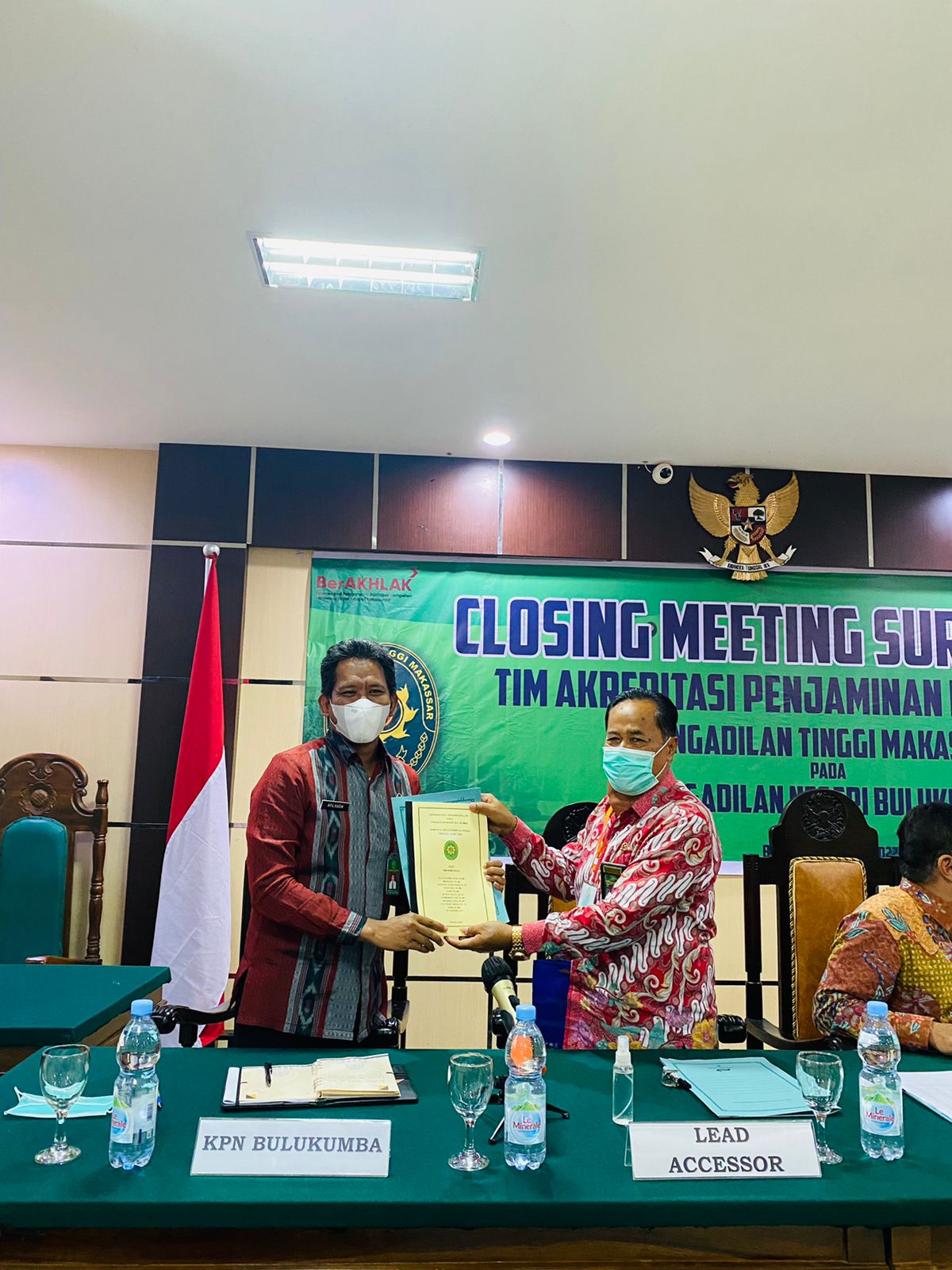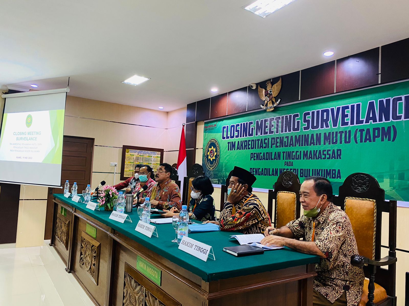 Assesment ini ditutup dengan dilaksanakannya Rapat Penutupan (Closing Meeting). Dalam rapat ini disampaikan hasil assesment yang dilaksanakan oleh Tim Akreditasi Penjaminan Mutu berupa temuan minor yang harus ditindaklanjuti oleh Pengadilan Negeri Bulukumba. Acara ini diakhiri dengan penyerahan hasil assesment oleh Tim Surveillance kepada Ketua Pengadilan Negeri Bulukumba Bpk. Dr. Adil Kasim , S.H., M.H.