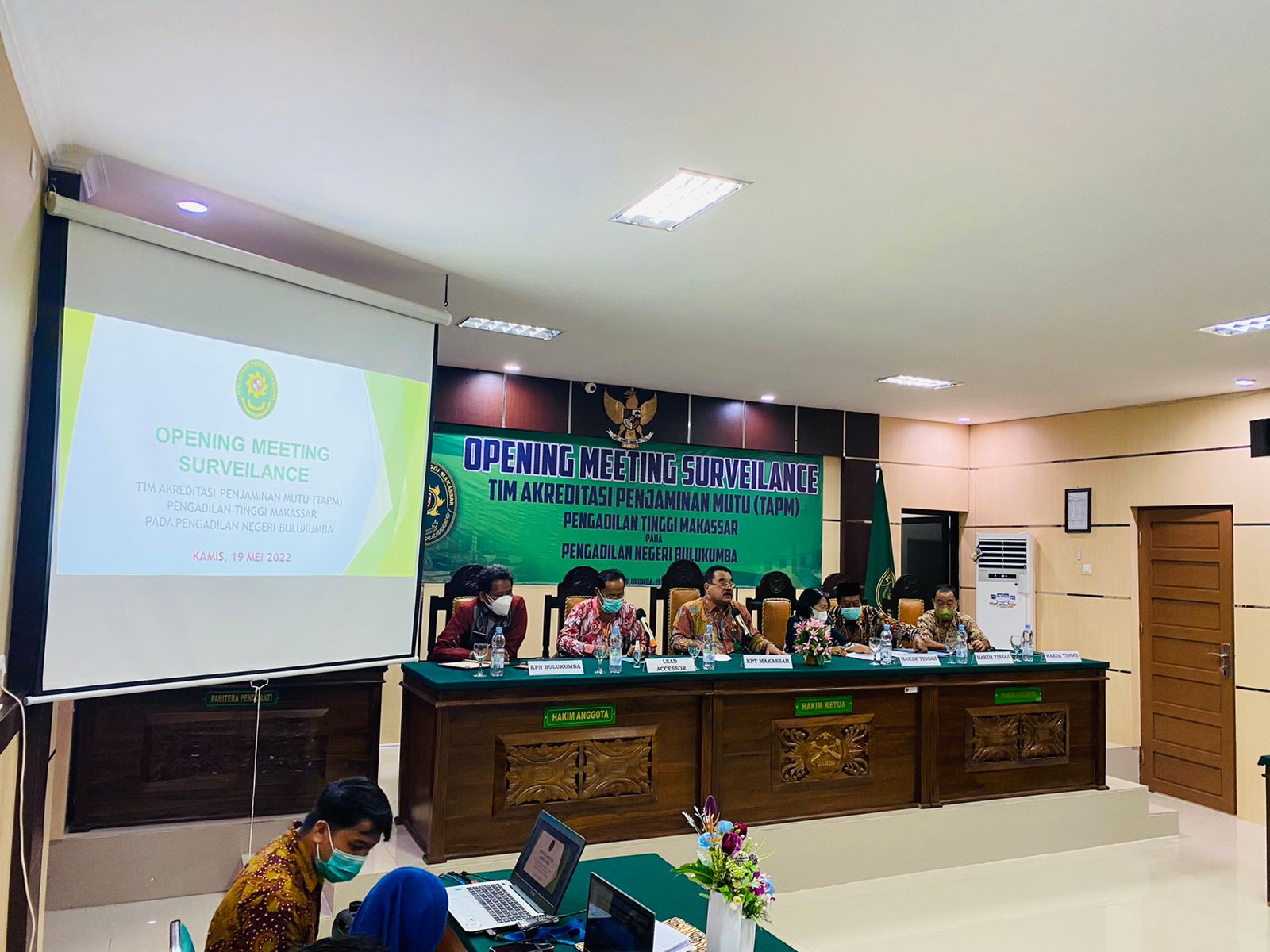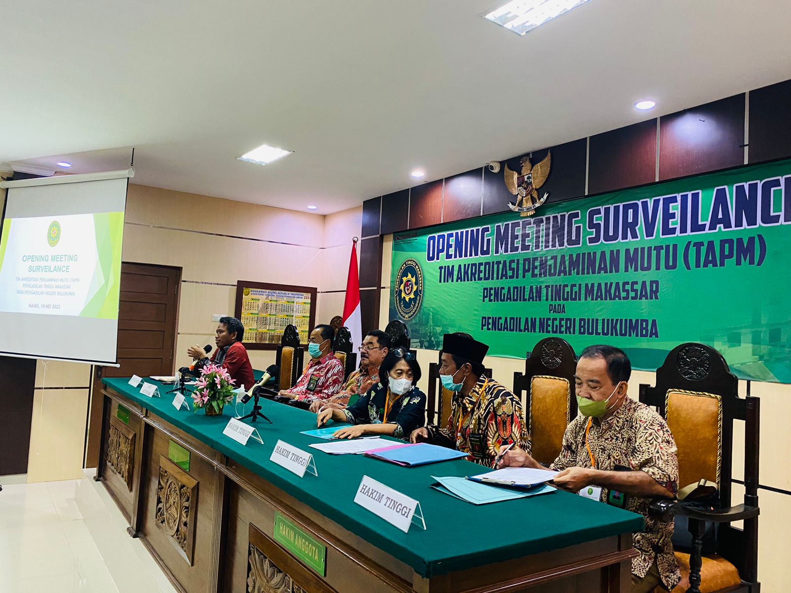 Assesment Surveillance Akreditasi Penjaminan Mutu ini dilaksanakan dalam rangka mewujudkan performa/kinerja peradilan yang unggul/prima. Assesment Surveillance Akreditasi Penjaminan Mutu diawali dengan rapat pembukaan (Opening Meeting) yang dilaksanakan di ruang sidang Utama Pengadilan Negeri Bulukumba yang diikuti seluruh keluarga besar Pengadilan Negeri Bulukumba.