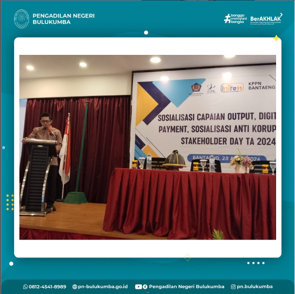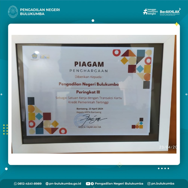 Pengadilan Negeri Bulukumba yang diwakili oleh Bendahara Pengeluaran, Ibu Prihar Kartikaningtyas. A.Md.Ak. menerima sertifikat penghargaan sebagai peringkat III dalam penggunaan uang persediaan melalui mekanisme digital payment & marketplace pemerintah dan kartu kredit pemerintah satker yang tertinggi saat menghadiri Acara Sosialisasi capaian output, digitalisasi payment, sosialisasi anti korupsi, stakeholder day TA 2024 yang dilaksanakan di KPPN Bantaeng. Berkat kerja keras dari bagian kesekretariatan khususnya Bapak Sekretaris serta bagian Umum & Keuangan sehingga Pengadilan Negeri Bulukumba dapat meraih capaian tersebut.