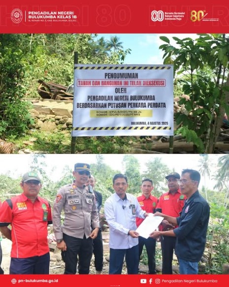 Pengadilan Negeri Bulukumba melaksanakan eksekusi perkara perdata No. 3/Pdt.G/2020/PN Blk jo. 320/PDT/2020/PT Mks yang bertempat di Desa Pataro, Kecamatan Herlang, Kabupaten Bulukumba. Kegiatan diawali dengan pengarahan dan doa bersama yang dipimpin langsung oleh Yang Mulia Ernawaty, S.H., M.H., (Ketua Pengadilan Negeri Bulukumba) dengan harapan agar seluruh rangkaian eksekusi dapat berjalan lancar, aman, serta diberi perlindungan dan kekuatan bagi seluruh petugas yang melaksanakannya. Selanjutnya, dilaksanakan apel persiapan eksekusi di halaman Polres Bulukumba, dipimpin oleh Kapolres Bulukumba didampingi Kabag Ops, sebagai bentuk sinergi antarlembaga dalam menjaga ketertiban dan kelancaran pelaksanaan tugas negara. Eksekusi dilaksanakan oleh Panitera PN Bulukumba, Bapak Angri Junanda, S.H., atas perintah Ketua Pengadilan Negeri Bulukumba. Turut mendampingi: Panitera Muda Perdata, Panitera Pengganti, Juru Sita, Jurusita Pengganti, serta seluruh tim eksekusi Pengadilan Negeri Bulukumba. Meskipun terjadi penolakan dari pihak tergugat di lapangan, eksekusi tetap berlangsung secara tertib dan lancar, sesuai dengan prosedur hukum yang berlaku.