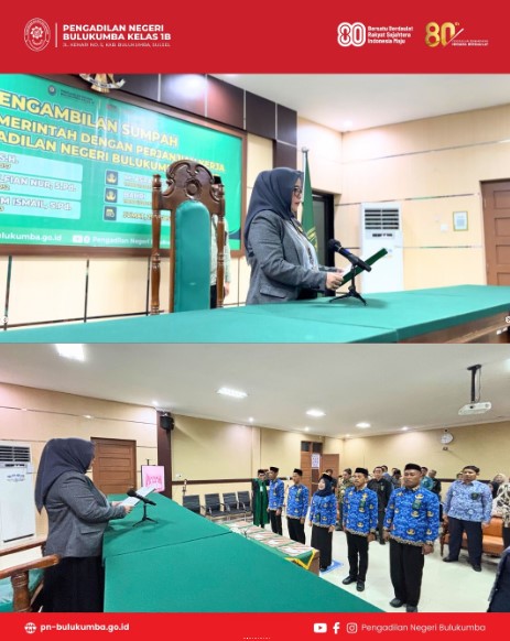Bertempat di Kantor Pengadilan Negeri Bulukumba telah dilaksanakan acara Pengambilan Sumpah Pegawai Pemerintah dengan Perjanjian Kerja (PPPK) Pengadilan Negeri Bulukumba. Acara ini dipimpin langsung oleh Ketua Pengadilan Negeri Bulukumba, Ibu Ernawaty, S.H., M.H. Adapun Pegawai Yang diambil sumpahnya yakni : 1. Muliani, S.H. 2. Muh. Ilham Ismail, S.Pd. 3. M. Asran, S.Kom. 4. Ahmad Alfian Nur, S.Pd. 5. Bahri Kelimanya telah resmi menjadi Pegawai Pemerintah dengan Perjanjian Kerja (PPPK) pada Pengadilan Negeri Bulukumba. Ketua Pengadilan Negeri Bulukumba dalam sambutannya menyampaikan ucapan selamat dan harapan agar PPPK yang baru dilantik dapat mengemban tugas dengan penuh tanggung jawab, selalu bersyukur, dan tetap menjadi pribadi yang baik dan berintegritas serta berkontribusi secara positif Acara ditutup dengan ucapan selamat dan sesi foto bersama sebagai bentuk kebersamaan dan dukungan seluruh keluarga besar Pengadilan Negeri Bulukumba.