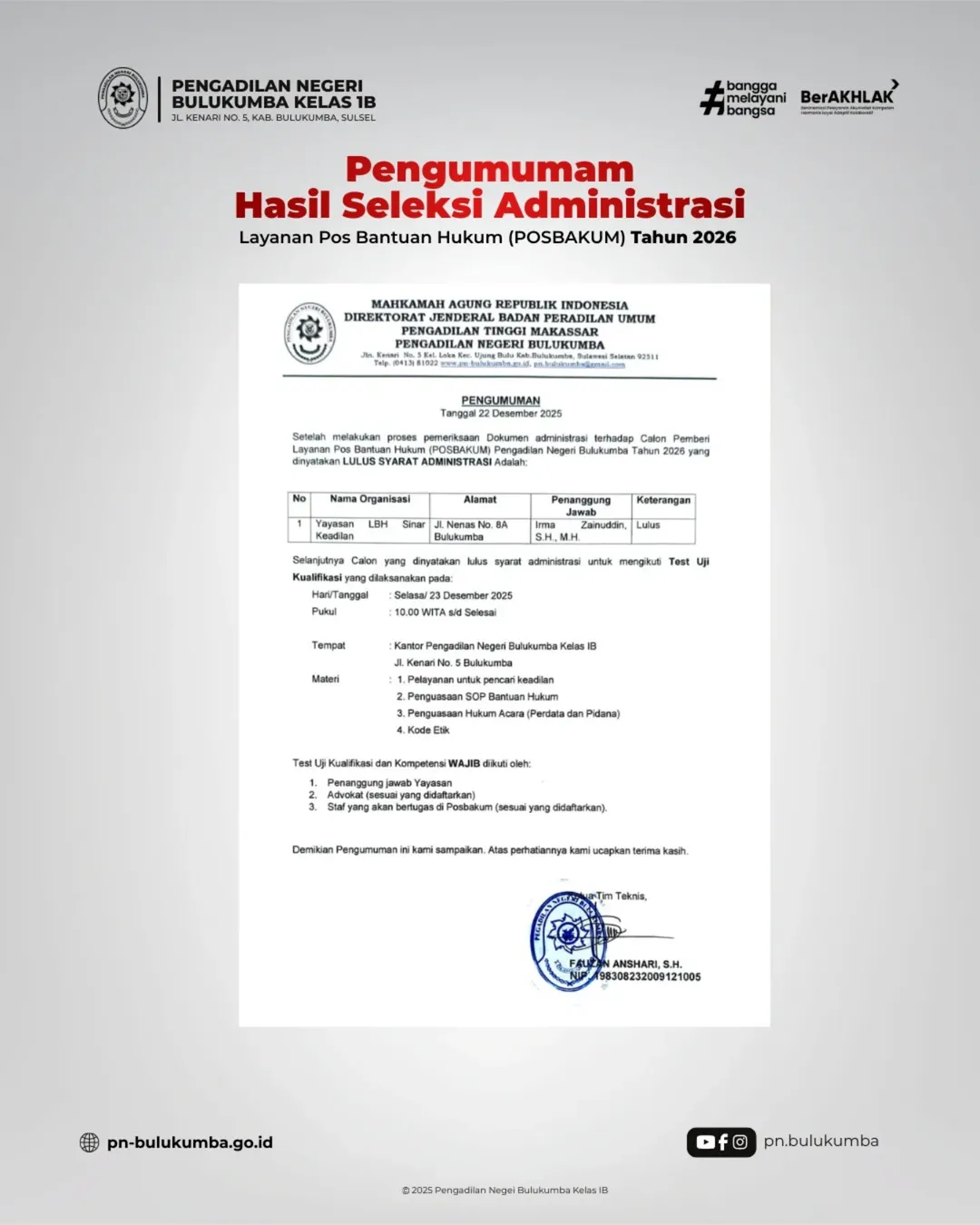 Pengumuman Hasil Seleksi Administrasi POSBAKUM Tahun 2026