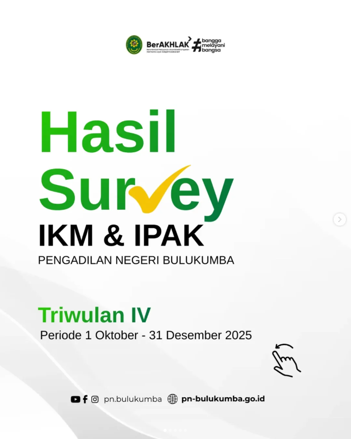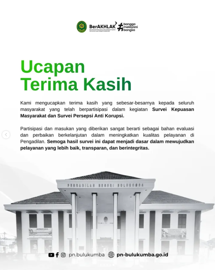 Survei ini merupakan bentuk komitmen Pengadilan Negeri Bulukumba dalam mengukur tingkat kepuasan masyarakat serta persepsi terhadap integritas dan upaya pencegahan korupsi dalam penyelenggaraan pelayanan publik.