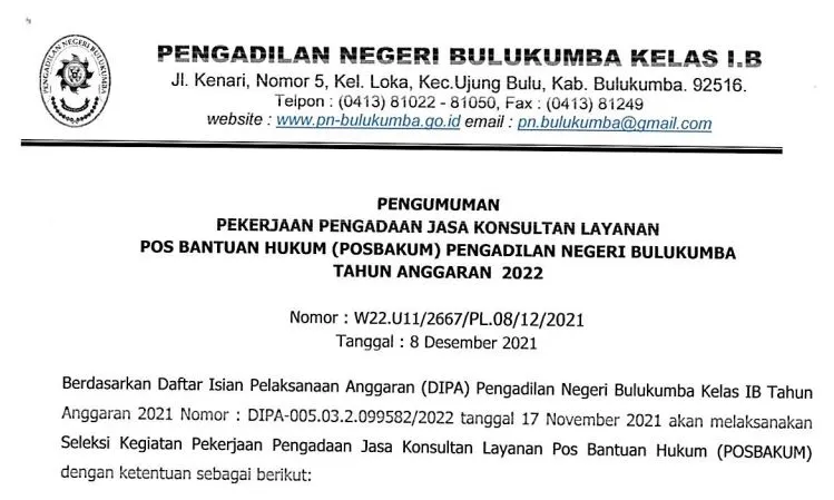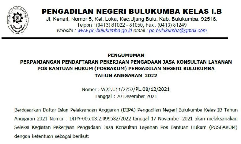 Bulukumba, Senin 20 Desember 2021. Pengumuman Perpanjangan Pendaftaran Pekerjaan Pengadaan Jasa Konsultan Layanan Pos Bantuan Hukum (Posbakum) Pengadilan...