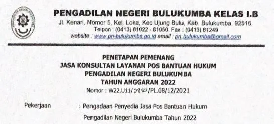 Penetapan Pemenang Jasa Konsultan Layanan Pos Bantuan Hukum Pengadilan Negeri ulukumba T.A 2022