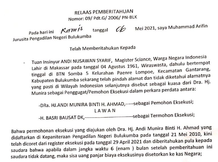 Relas Pemberitahuan Kepada Bp Andi Nusawan Syarif Mengenai Permohonan Eksekusi Yang Dicoret Dari Register Eksekusi Per Tanggal 29 April 2021