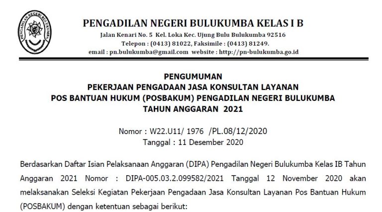 Pengumuman Pekerjaan Pengadaan Jasa Konsultan Layanan Pos Bantuan Hukum (Posbakum) Pengadilan Negeri Bulukumba Tahun Anggaran 2021