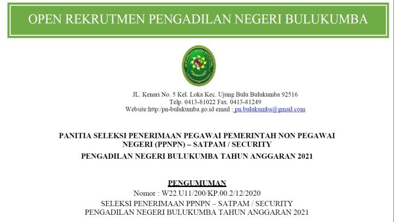 Pengumuman Rekrutmen PPNPN (Pegawai Pemerintah Non Pegawai Negeri Sipil) Posisi Satuan Pengamanan (Security) Pada Pengadilan Negeri Bulukumba Kelas 1B