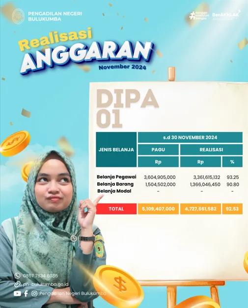 Bulukumba, Jum’at 3 Januari 2025. Infografis Realisasi Anggaran DIPA 01 dan DIPA 03 Pengadilan Negeri...