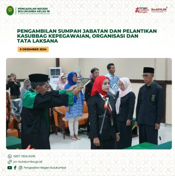 Bulukumba, 6 Desember 2024 Pengadilan Negeri Bulukumba menyelenggarakan acara Pengambilan Sumpah Jabatan dan Pelantikan. Dalam...