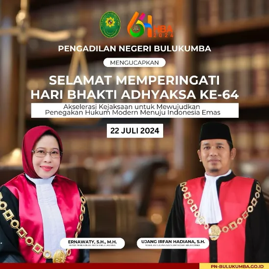 Pimpinan dan Seluruh Keluarga Besar Pengadilan Negeri Bulukumba mengucapkan Selamat Memperingati Hari Bhakti Adhyaksa Ke...
