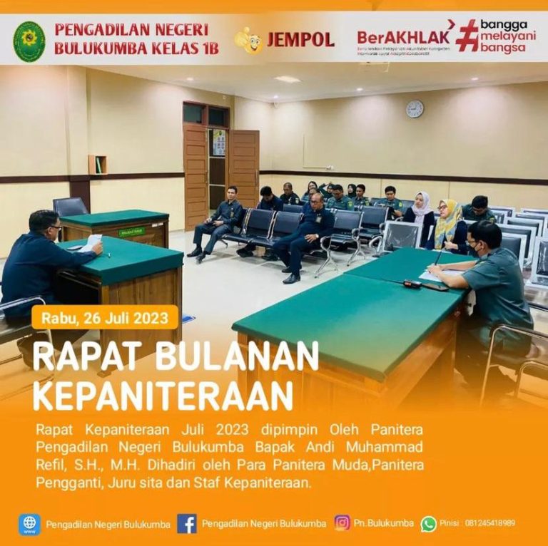 Bulukumba, Rabu 26 Juli 2023.Bertempat di ruang sidang utama telah dilaksanakan kegiatan rapat bulanan kepaniteraan periode...