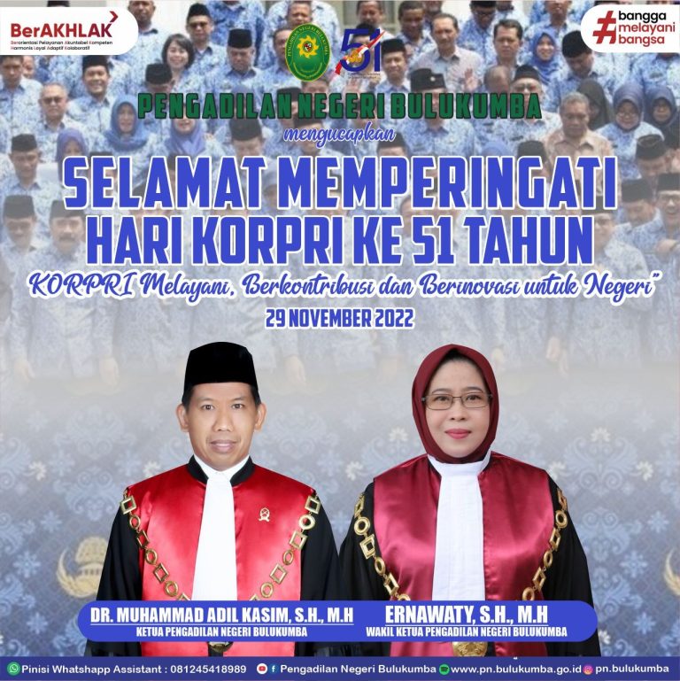 Segenap Pimpinan dan Keluarga Besar Pengadilan Negeri Bulukumba mengucapkan Selamat Memperingati Hari Korpri “KORPRI Melayani, Berkontribusi...