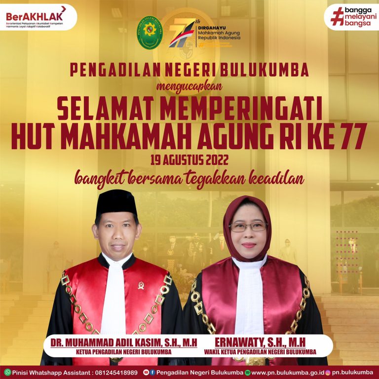 Segenap Pimpinan dan Keluarga Besar Pengadilan Negeri Bulukumba mengucapkan Selamat Memperingati HUT Ke 77 Mahkamah Agung...