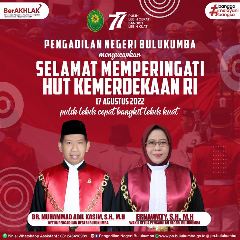 Segenap Pimpinan dan Keluarga Besar Pengadilan Negeri Bulukumba mengucapkan Selamat Memperingati HUT Ke 77 Kemerdekaan Republik...