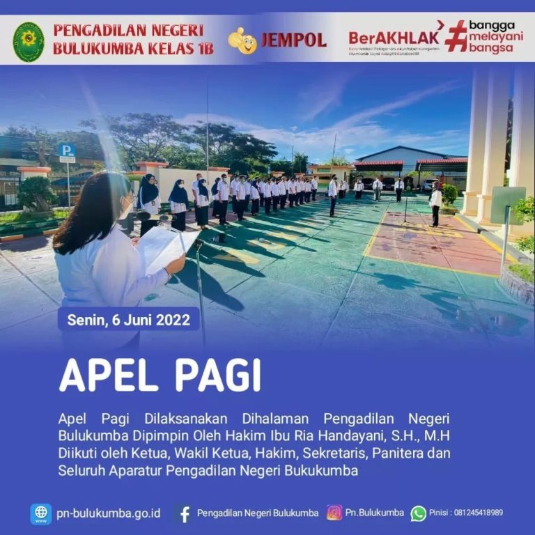 Bulukumba, Senin 30 Mei 2022. Apel pagi dipimpin oleh Ibu Ria Handayani S,H., MH., (Hakim Pengadilan Negeri...