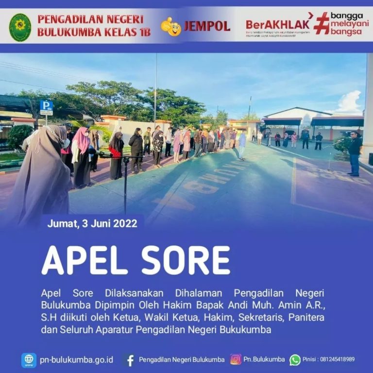 Bulukumba, Jumat 3 Juni 2022.Bertempat di halaman kantor Pengadilan Negeri Bulukumba telah dilaksanakan Apel sore...