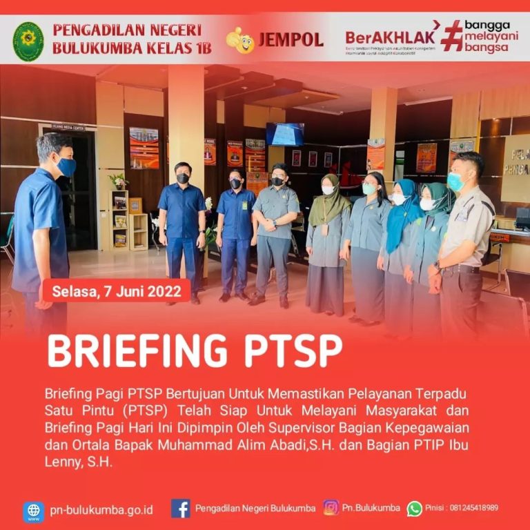 Bulukumba, Selasa 07 Juni 2022. Briefing pagi tim petugas PTSP dipimpin oleh Bp. Abd. Halik, S,H., (Panitera...