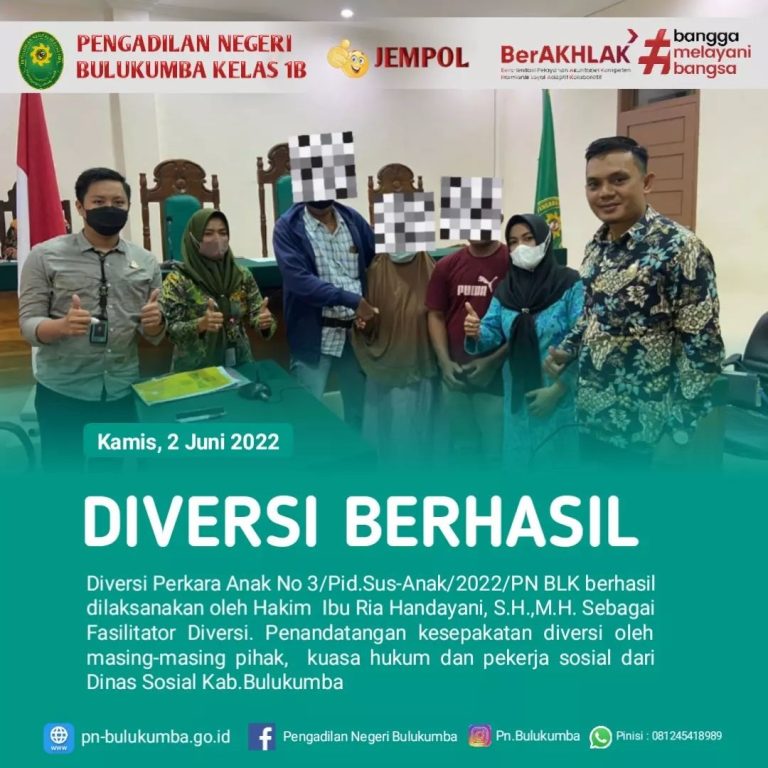 Bulukumba, Jumat 2 Juni 2022. Diversi perkara anak No. 3/Pid.Sus-Anak/2022/PN Blk berhasil dilaksanakan oleh Ibu Ria Handayani,...