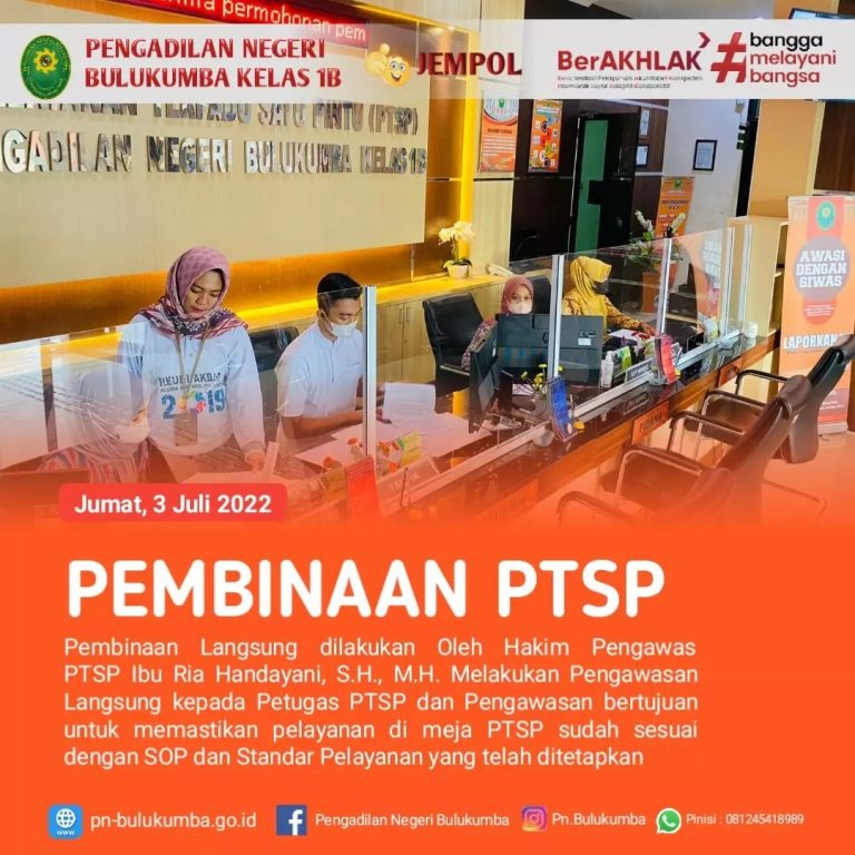 Bulukumba, Jumat 3 Juni 2022.Telah dilaksanakan Pembinaan dan Pengawasan PTSP oleh Hakim Pengawas Ibu Ria Handayani...