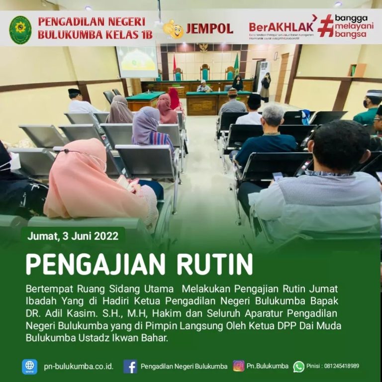 Bulukumba, Jumat 3 Juni 2022. Pengadilan Negeri Bulukumba menyelenggarakan kegiatan Kajian Alquran dengan pembicara Ustadz Ichwan Bahar...