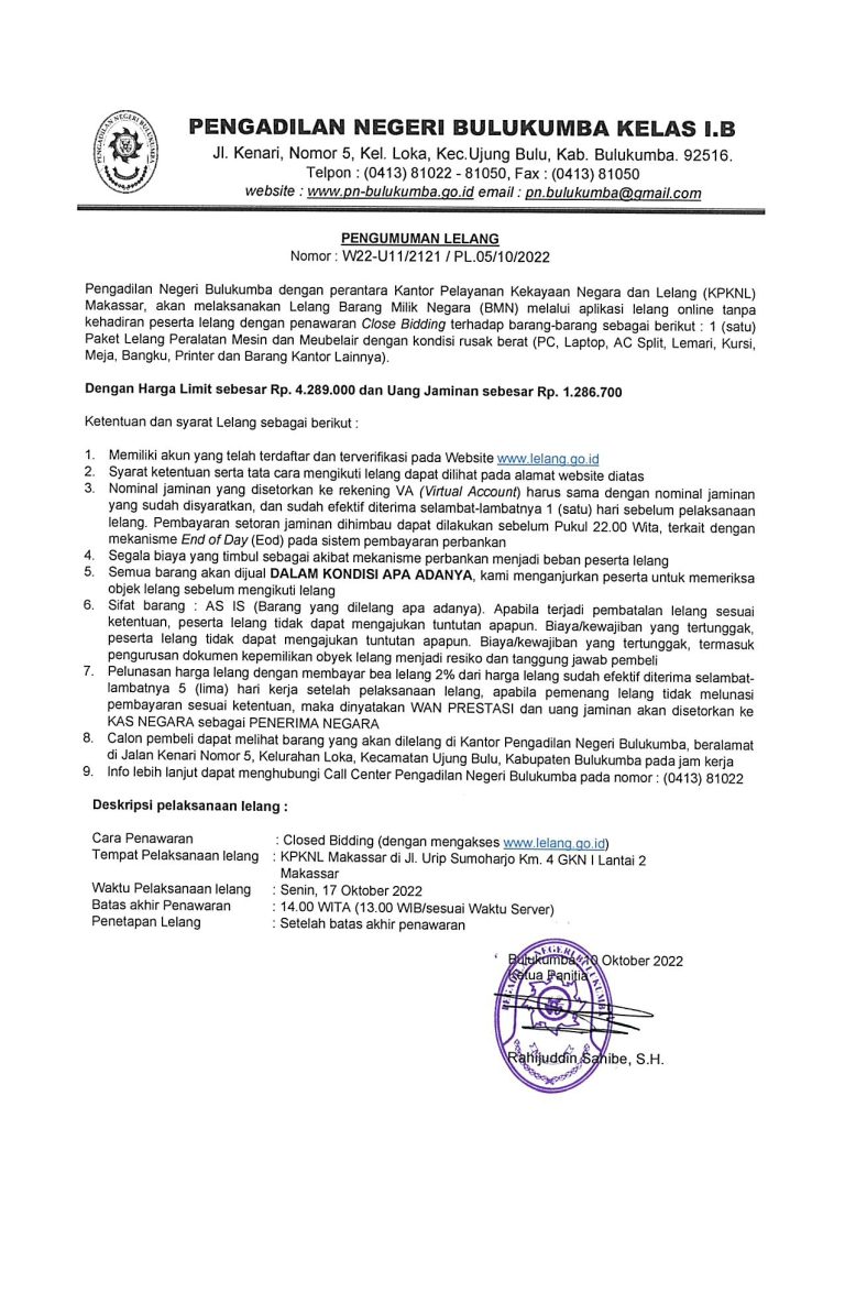 PENGUMUMAN LELANG BMN PENGADILAN NEGERI BULUKUMBA 17 OKTOBER 2022