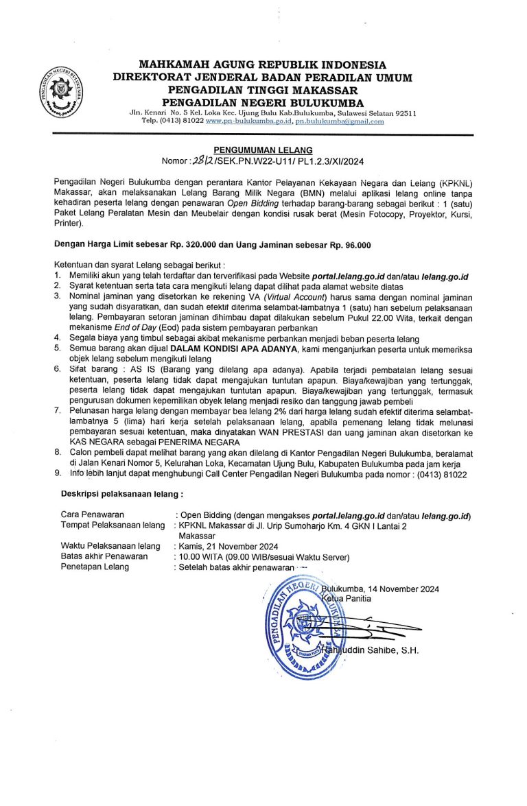 PENGUMUMAN LELANG BMN PENGADILAN NEGERI BULUKUMBA 14 NOVEMBER 2024