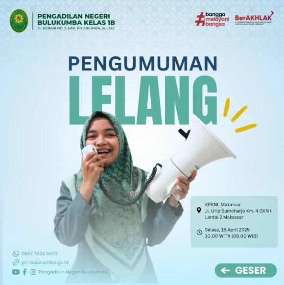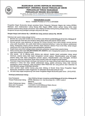 PENGUMUMAN LELANG Nomor : 733/SEK.PN.W22-U11/PL1.2.3/IV/2025 Pengadilan Negeri Bulukumba dengan perantaraan Kantor Pelayanan Kekayaan Negara dan Lelang (KPKNL) Makassar,…