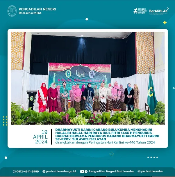 Dharmayukti Karini Cabang Bulukumba Menghadiri Halal Bi Halal Hari Raya Idul Fitri 1445 H Pengurus Daerah Bersama Pengurus Cabang Dharmayukti Karini Se-Prov. Sulawesi Selatan dirangkaikan dengan Peringatan Hari Kartini