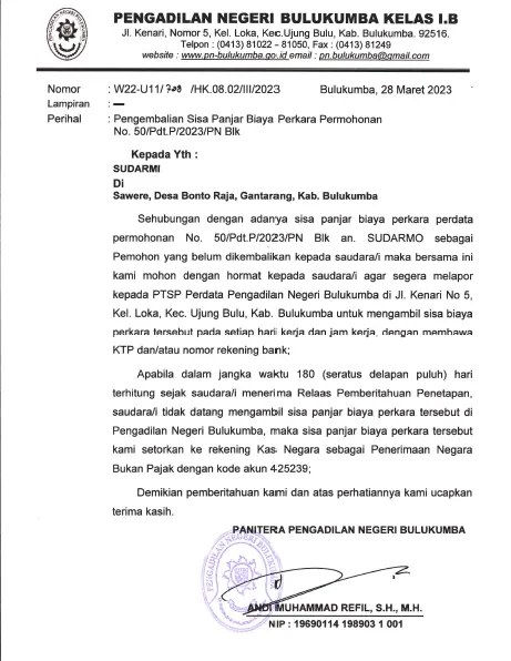 Bulukumba, Selasa 28 Maret 2023. Kepada Yth. SUDARMO di Sawere, Desa Bonto Raja, Gantarang, Kab. Bulukumba Sehubungan dengan adanya sisa…