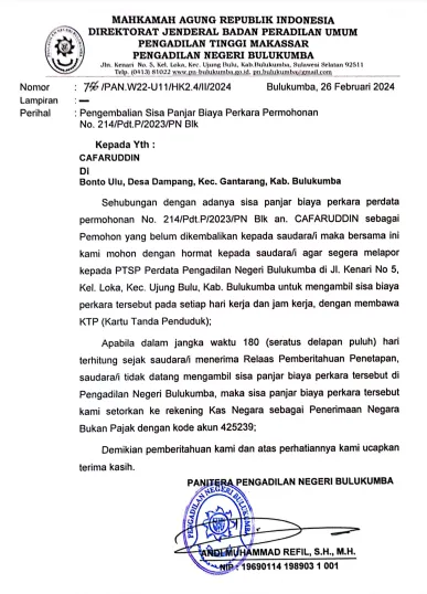 Bulukumba, Selasa 27 Februari 2024. Kepada Yth. CAFARUDDIN di Bonto Ulu, Desa Dampang, Kec. Gantarang, Kab. Bulukumba Sehubungan dengan …