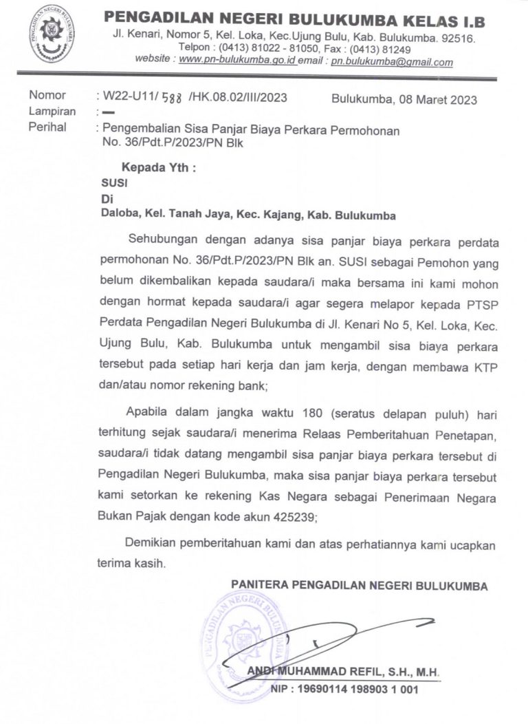 Pengembalian Sisa Panjar Biaya Perkara Permohonan No 36/Pdt.P/2023/PN Blk