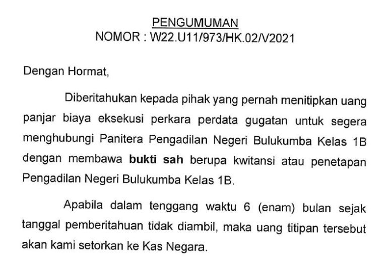 Kamis, 6 Mei 2021. Diberitahukan kepada para pihak yang pernah menitipkan uang panjar biaya eksekusi perkara perdata gugatan untuk…
