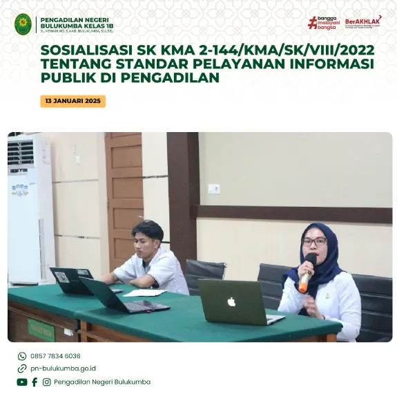 Bulukumba, 13 Januari 2025 bertempat di Kantor Pengadilan Negeri Bulukumba diadakan Sosialisasi SK KMA 2-144/KMA/SK/VIII/2022 tentang standar pelayanan…