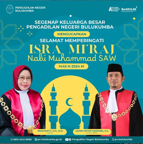 Keluarga Besar Pengadilan Negeri Bulukumba mengucapkan: Selamat Memperingati Isra Mi’raj Nabi Muhammad SAW. Jadikan momen peringatan Isra Mi’raj…