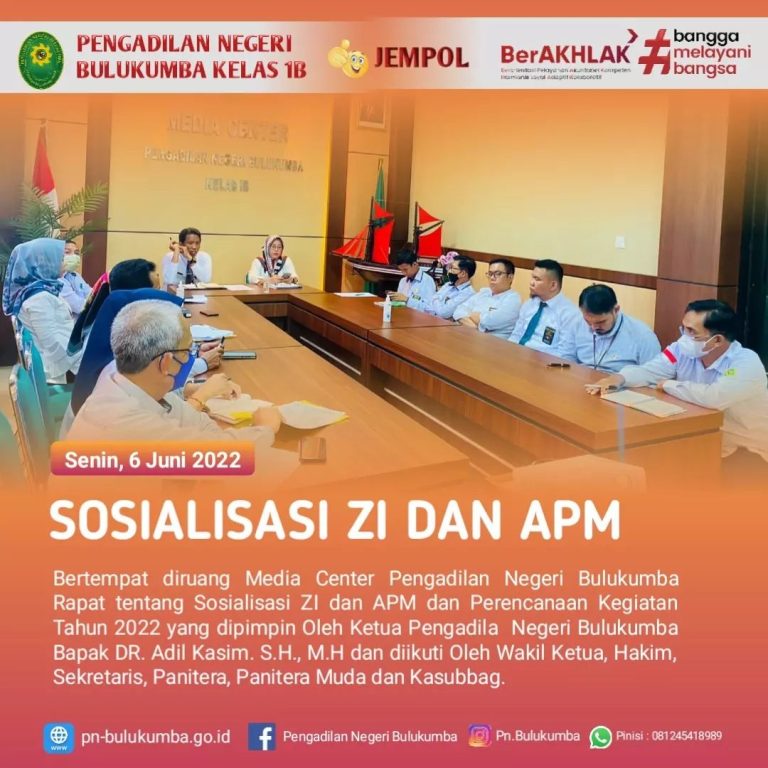 Bulukumba, Senin 6 Juni 2022.Bertempat di ruang media center Pengadilan Negeri Bulukumba telah dilaksanakan Sosialisasi Zona Integritas dan APM…
