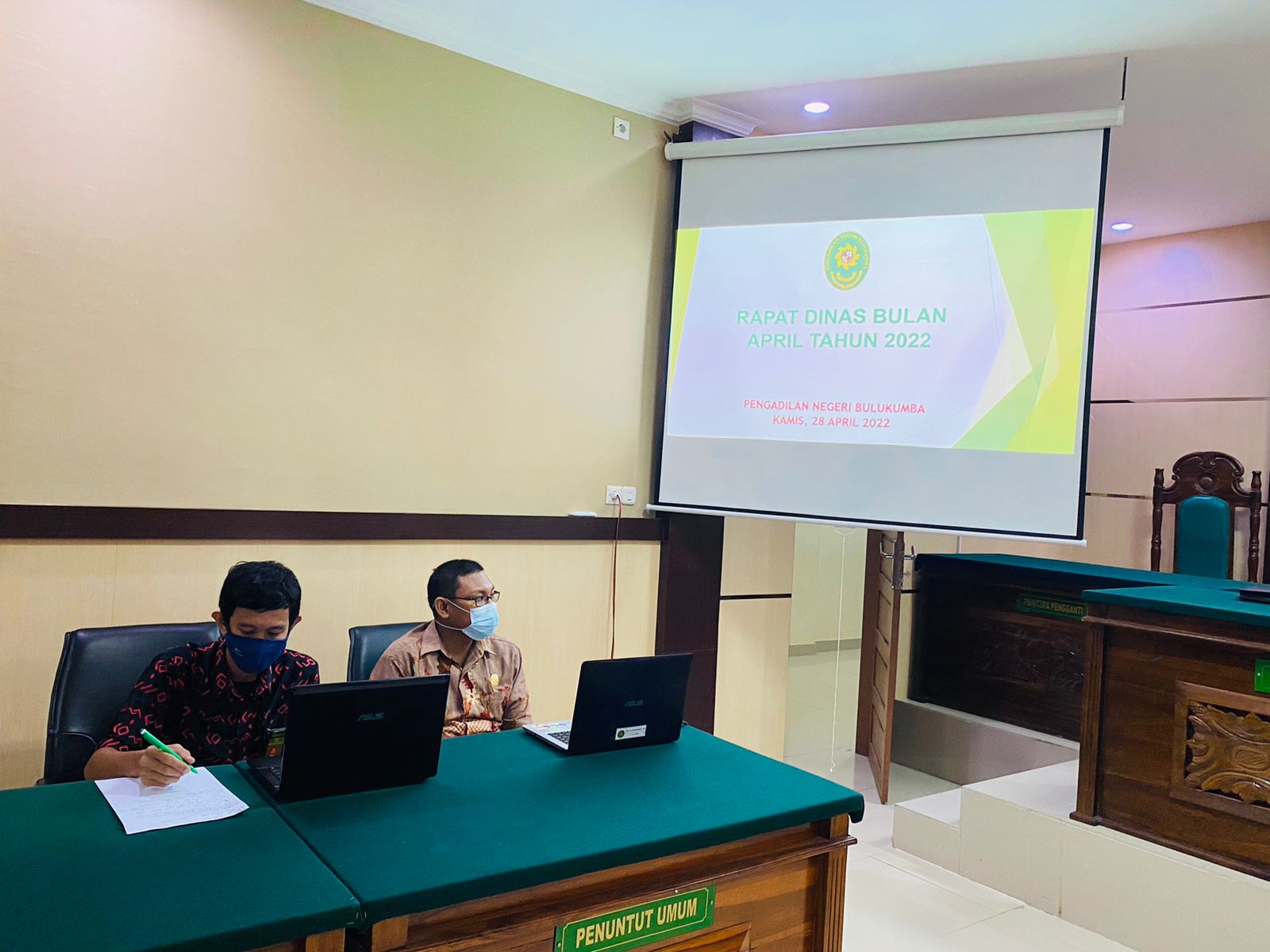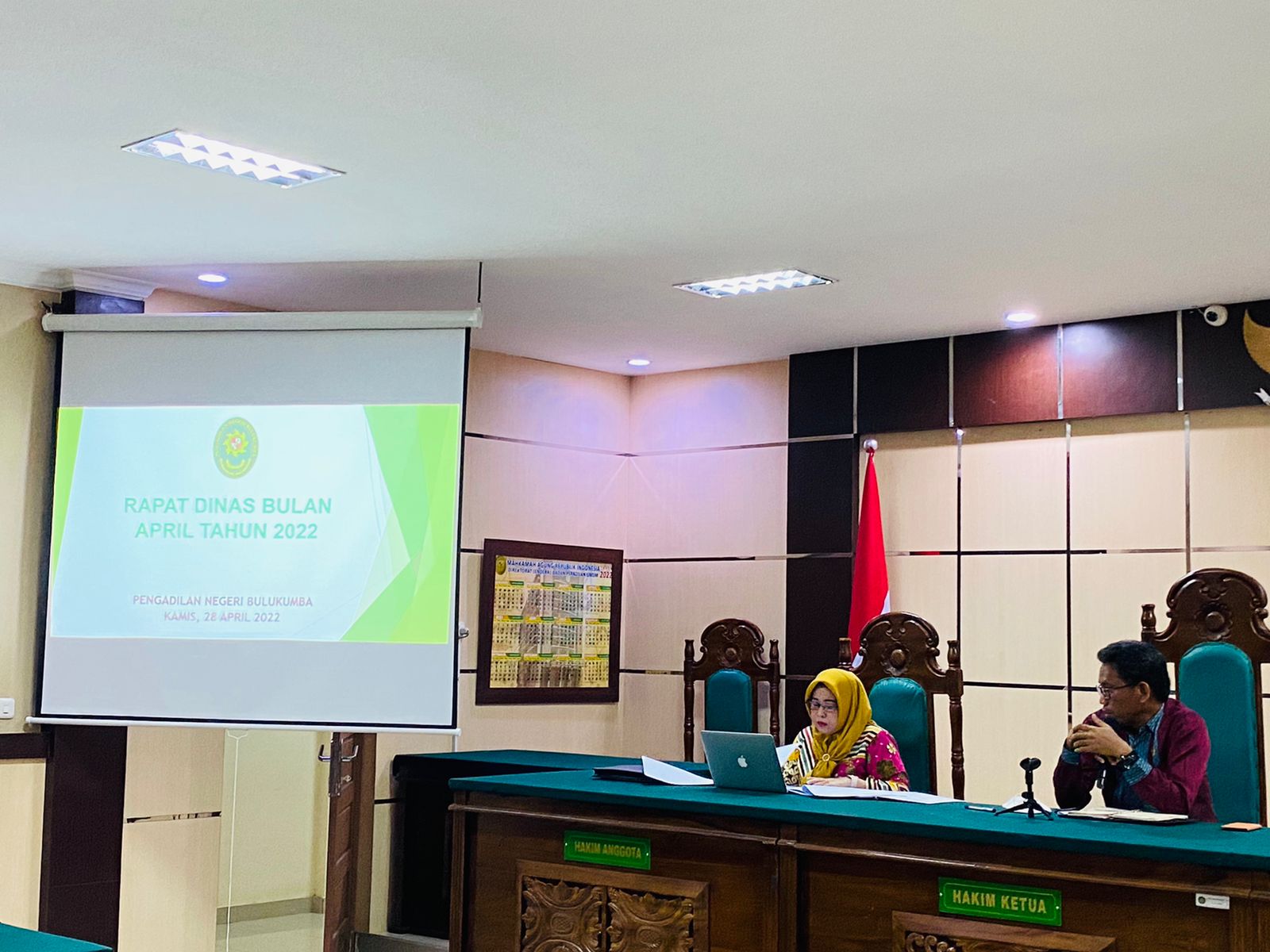 Bulukumba, Kamis 28 April 2022. Bertempat di Ruang Sidang Utama, telah dilaksanakan Rapat Dinas Bulan April Tahun 2022. Dipimpin oleh Ketua PN Bulukumba Bp. Dr. Adil Kasim SH, MH. dan Wakil Ketua Ibu Ernawaty SH, MH. serta dihadiri oleh Para Hakim, Sekretaris, Plt Panitera, Pejabat Struktural/Fungsional, Staf dan PPNPN