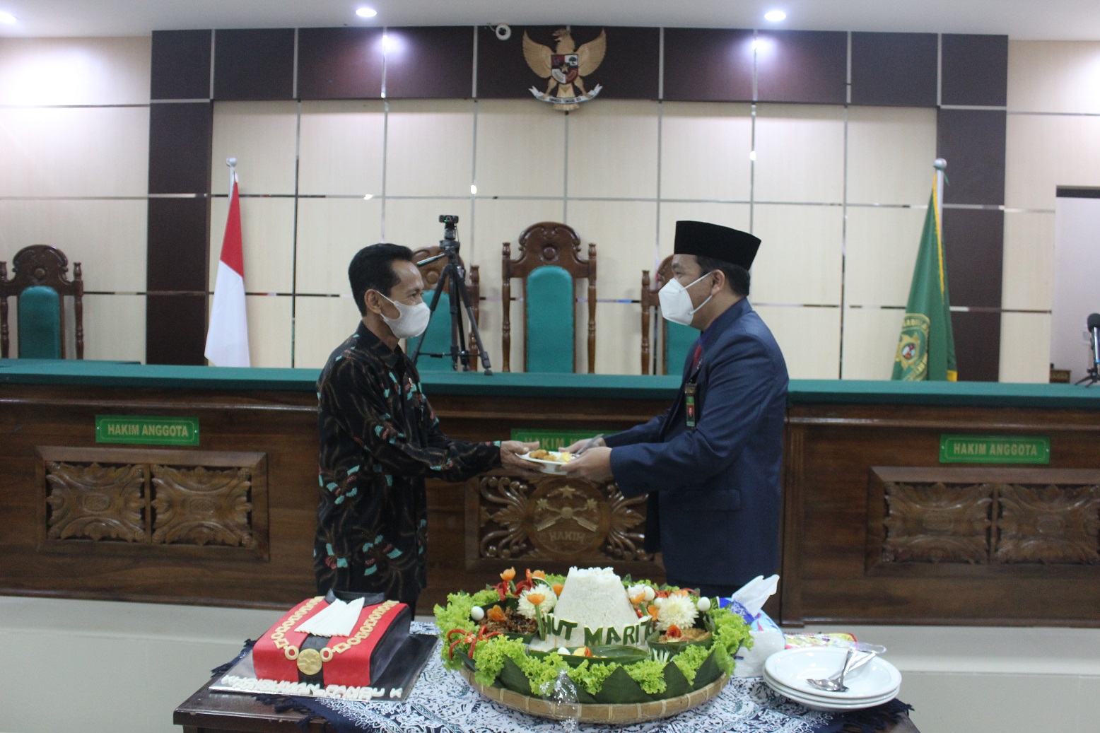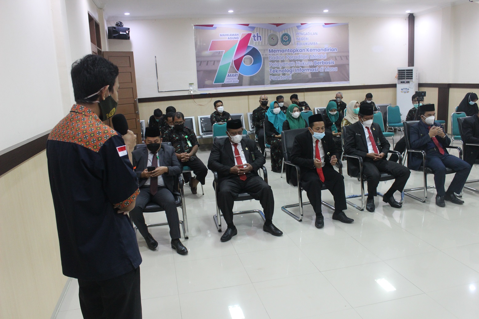 Kamis, 19 Agustus 2021 Pukul 09.00 WIB, Bertempat di Ruang Sidang Utama. Seluruh Pejabat Struktural, Hakim, beserta Pegawai Pengadilan Negeri Bulukumba Kelas IB mengikuti Upacara Bendera dalam rangka memperingati HUT Mahkamah Agung Republik Indonesia Ke - 76 secara virtual yang dipimpin oleh Yang Mulia Ketua Mahkamah Agung Dr. Muhammad Syarifuddin, S.H.,M.H. dengan tetap melaksanakan protokol kesehatan, Upacara berlangsung dengan sederhana dan khidmat.
