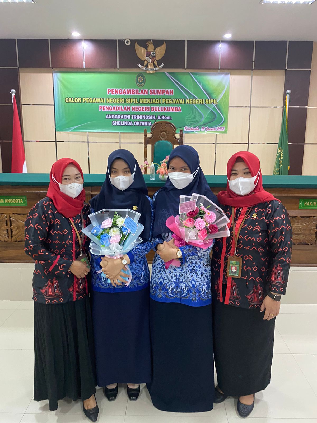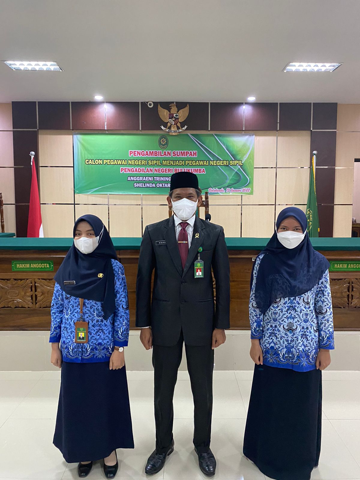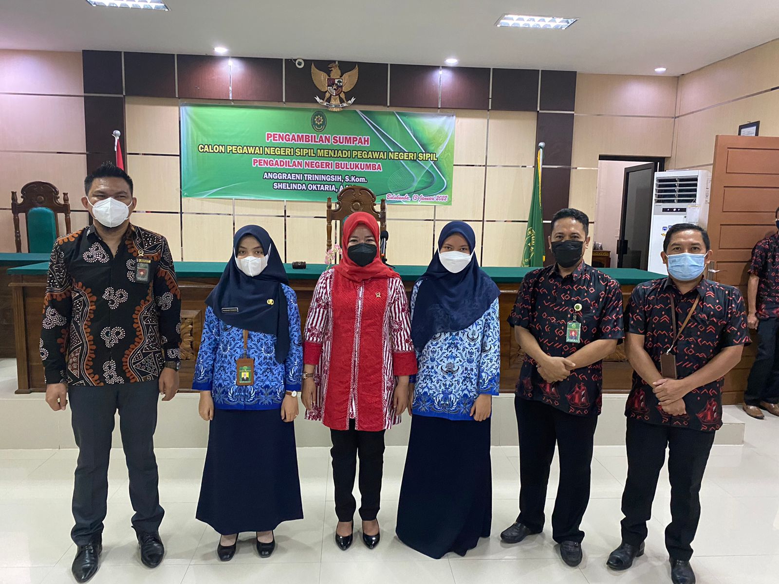Bulukumba 13 Januari 2022,Bertempat di sidang Pengadilan Agama Negara pukul 09.00 WITA dilaksanakan Pengambilan Sumpah Pegawai Negeri Sipil Anggraeni Triningsih, S.Kom. dan Shelinda Oktaria, A.Md yang telah melewati masa 1 (satu) tahun sebagai Calon Pegawai Negeri Sipil. Pelaksanaan Pengambilan Sumpah Pegawai Negeri Sipil dengan jabatan Pranata Komputer dan Arsparis ini dipimpin oleh Bpk. Adil Kasim, S.H, M.H. Ketua Pengadilan Negeri Bulukumba dan diikuti oleh segenap pegawai Pengadilan Negeri Bulukumba