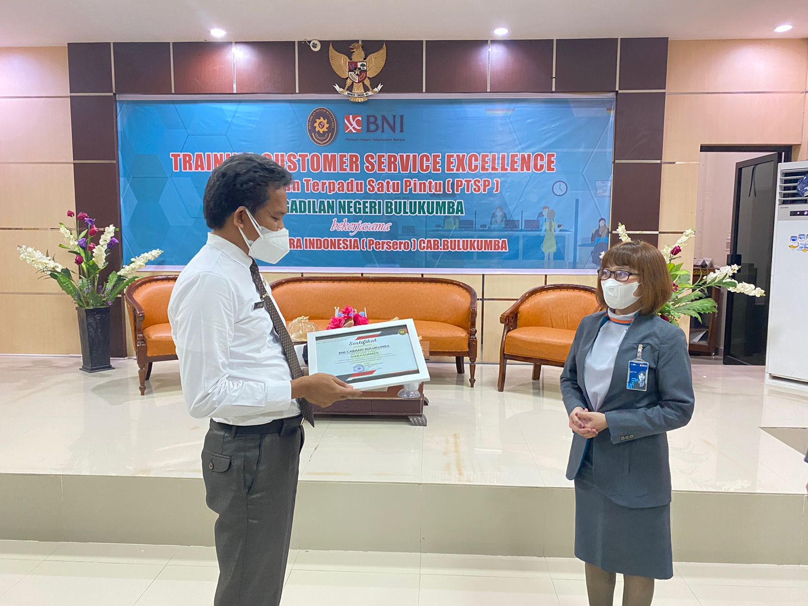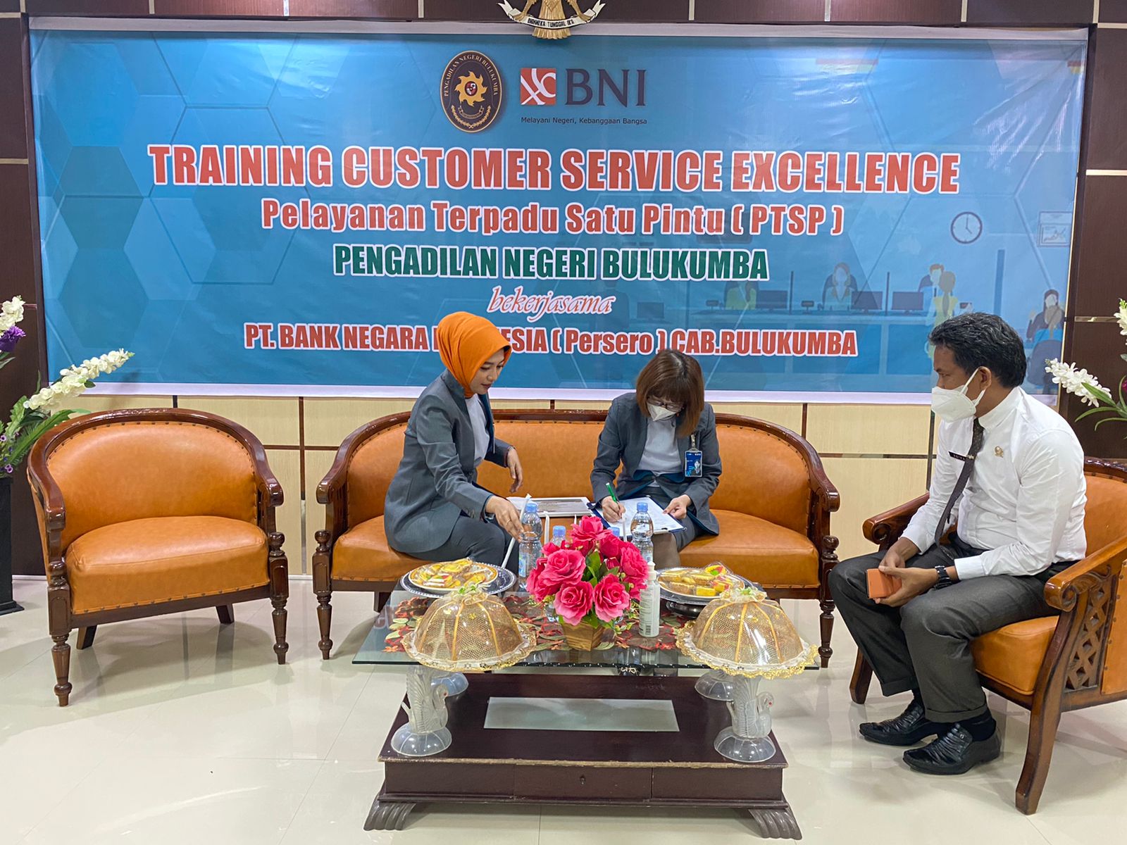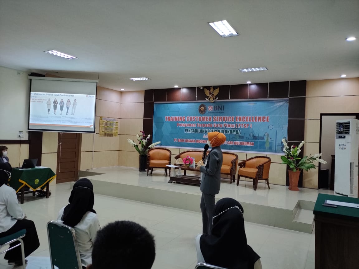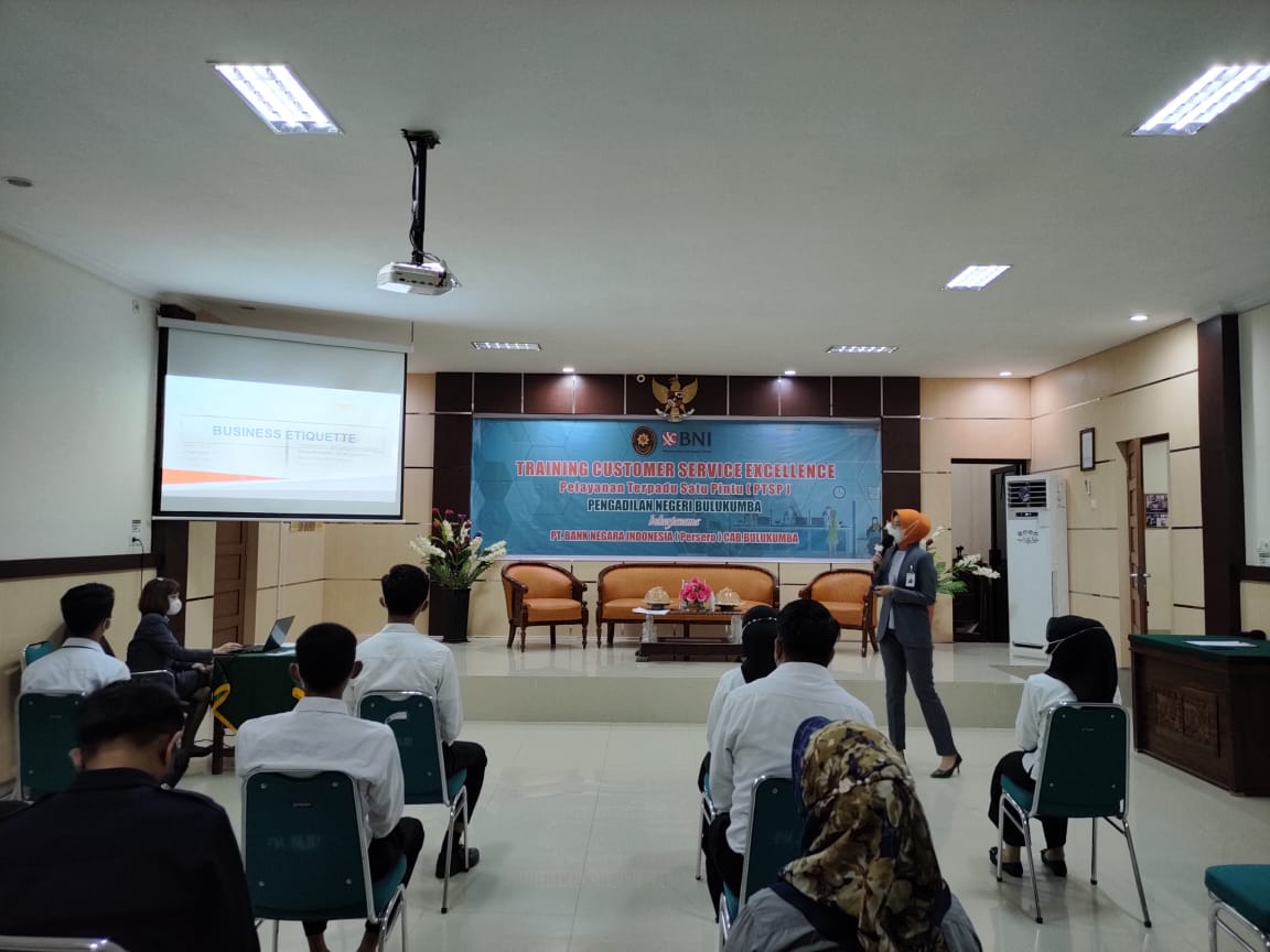 Bulukumba 16 Februari 2022. Bekerjasama dengan Bank Negara Indonesia (BNI) Cabang Bulukumba, Pengadilan Negeri Bulukumba menyelenggarakan Training Customer Service Excellence PTSP atau Pelatihan Pelayanan Prima Pelayanan Terpadu Satu Pintu (PTSP) untuk peningkatan kualitas pelayanan PTSP Pengadilan Negeri Bulukumba. Seluruh petugas frontliner PTSP dan Security diberikan materi mengenai standar pelayanan customer dan berkesempatan untuk langsung mempraktekannya dipandu oleh pemateri Ibu Wahyuni. Melalui kata sambutannya Ketua Pengadilan Negeri Bulukumba, Bp. Adil Kasim S.H., M.,H. berharap agar kegiatan ini dapat meningkatkan kemampuan petugas PTSP Pengadilan Bulukumba dan selanjutnya dapat memberikan pelayanan yang terbaik bagi masyarakat pencari keadilan.