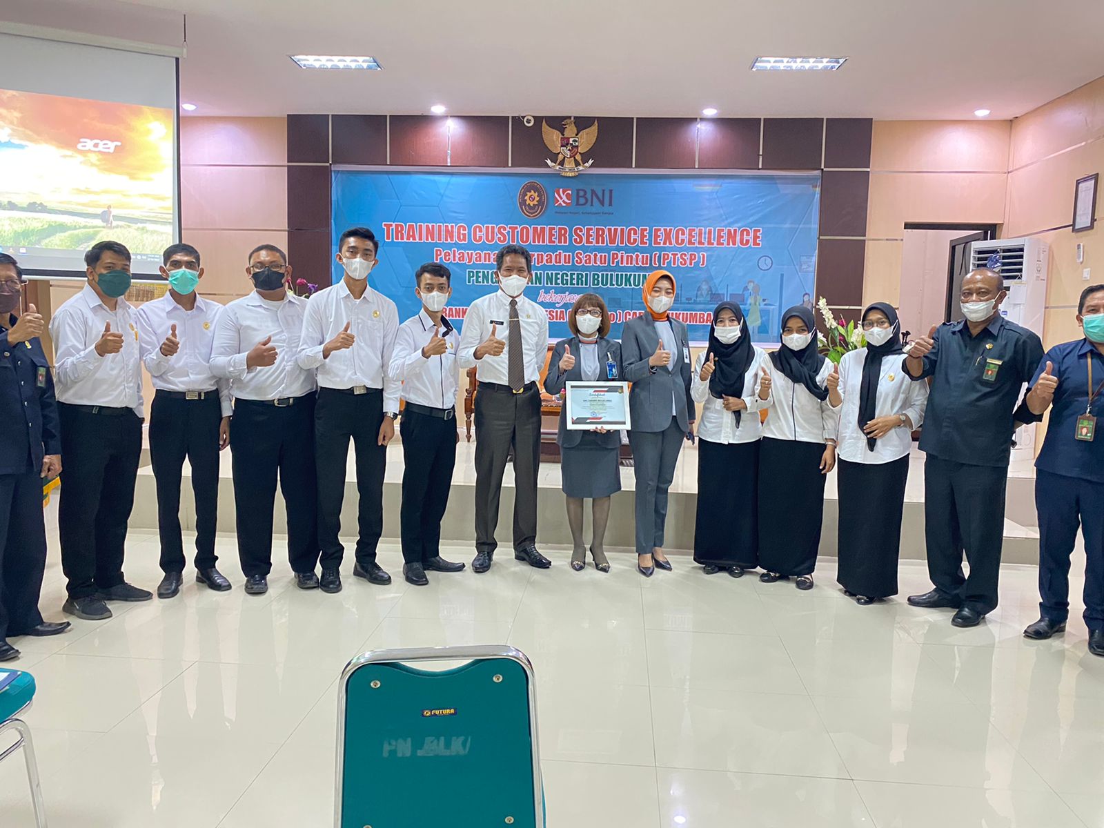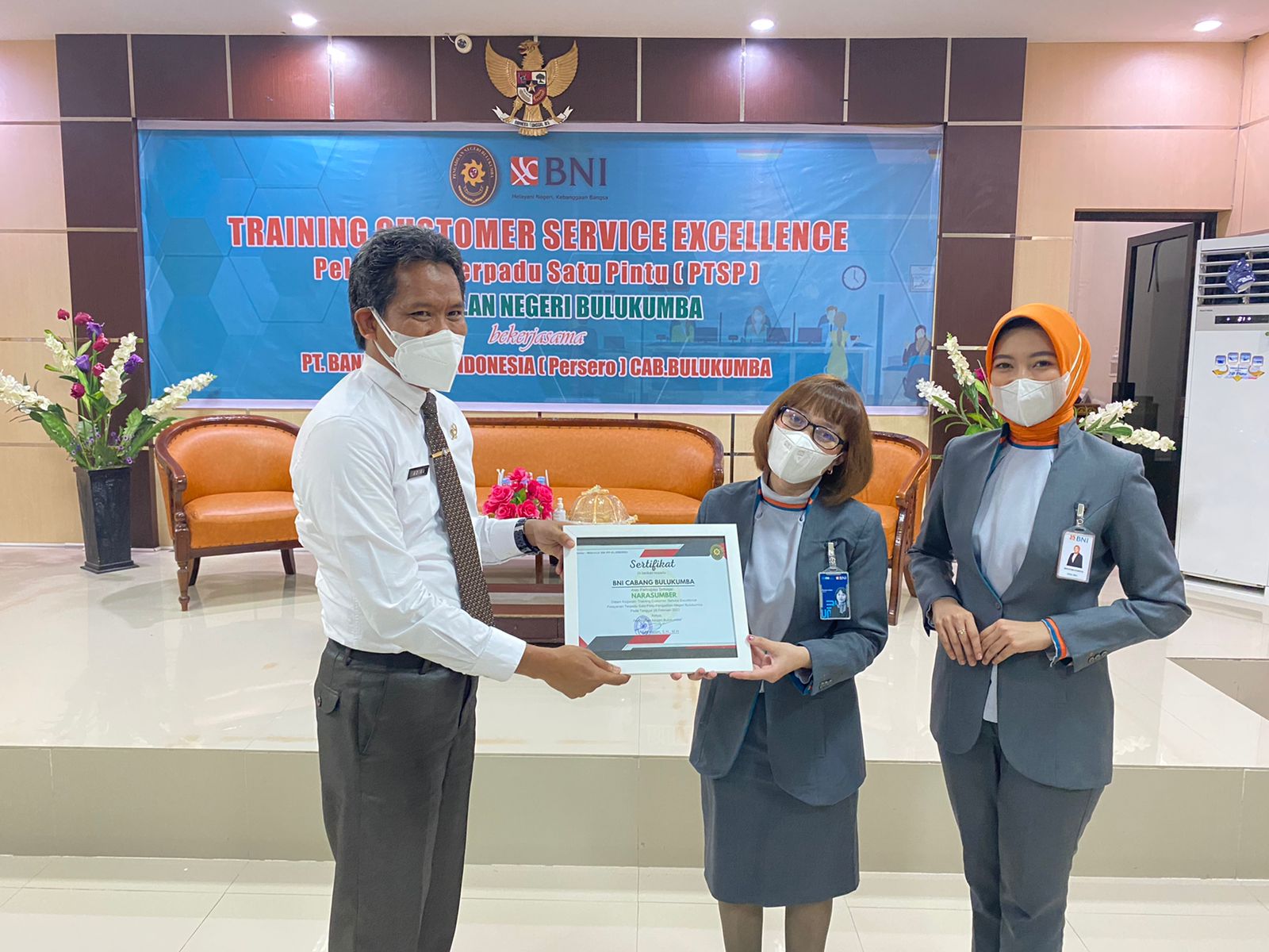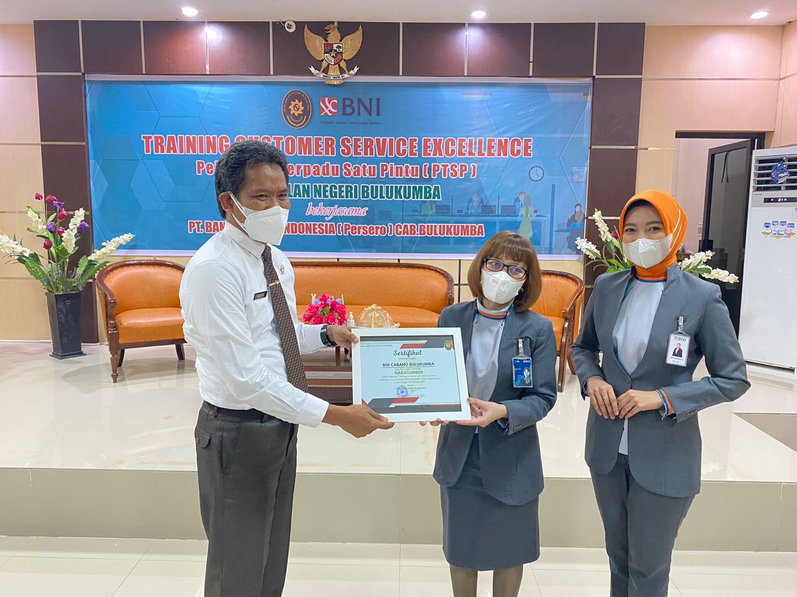 Bulukumba 16 Februari 2022. Bekerjasama dengan Bank Negara Indonesia (BNI) Cabang Bulukumba, Pengadilan Negeri Bulukumba menyelenggarakan Training Customer Service Excellence PTSP atau Pelatihan Pelayanan Prima Pelayanan Terpadu Satu Pintu (PTSP) untuk peningkatan kualitas pelayanan PTSP Pengadilan Negeri Bulukumba. Seluruh petugas frontliner PTSP dan Security diberikan materi mengenai standar pelayanan customer dan berkesempatan untuk langsung mempraktekannya dipandu oleh pemateri Ibu Wahyuni. Melalui kata sambutannya Ketua Pengadilan Negeri Bulukumba, Bp. Adil Kasim S.H., M.,H. berharap agar kegiatan ini dapat meningkatkan kemampuan petugas PTSP Pengadilan Bulukumba dan selanjutnya dapat memberikan pelayanan yang terbaik bagi masyarakat pencari keadilan.