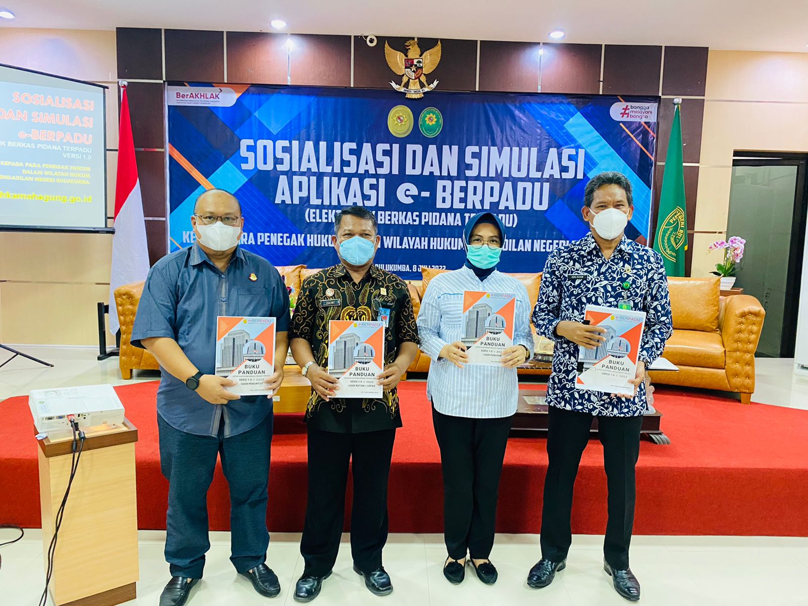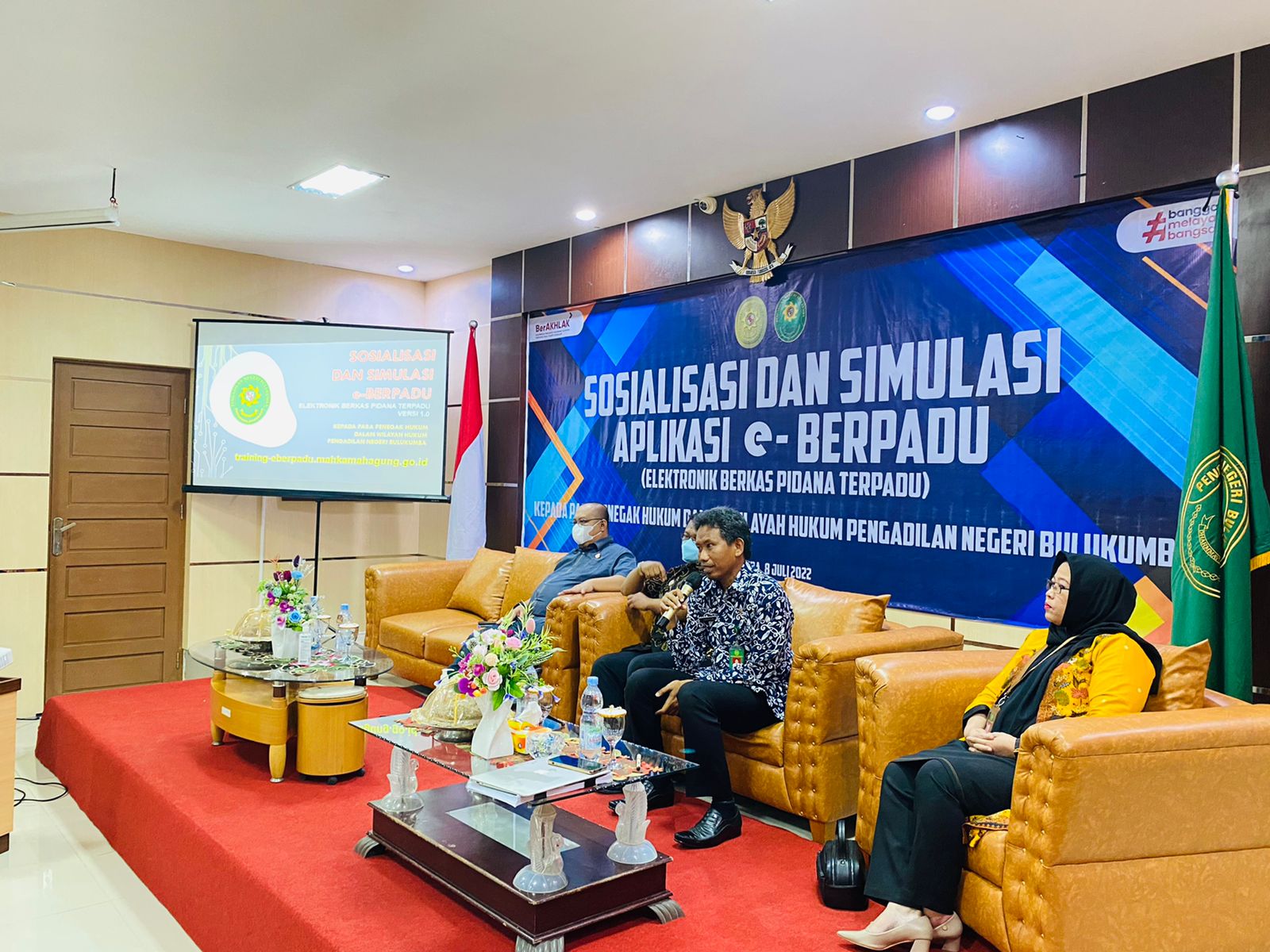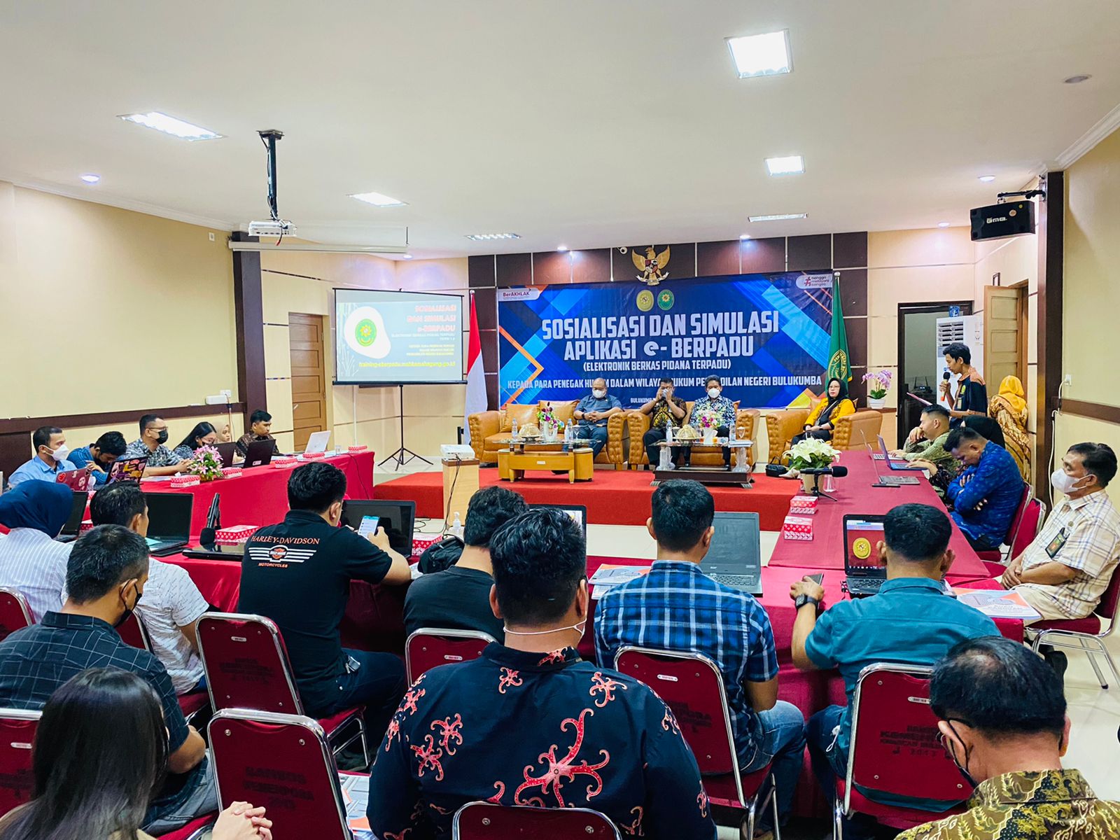 Bulukumba, Jumat 08 Juli 2022. Bertempat di ruang sidang utama Pengadilan Negeri Bulukumba, dilaksanakan Sosialisasi dan Simulasi Aplikasi Eletronik Berkas Perkara Terpadu (e-Berpadu) yang di buka langsung oleh Ketua Pengadilan Negeri Bulukumba, Bapak Dr. Muhammad Adil Kasim, S.H., M.H. yang di hadiri oleh Kepala Kajaksaan Negeri Bulukumba, Kepala Lembaga Pemasyarakatan Kelas IIA Bulukumba, Wakil Ketua Pengadilan Negeri Bulukumba, dan Perwakilan Kapolres Bulukumba. Peserta Kegiatan ini adalah Para Hakim, Penyidik Polres Bulukumba, Kasi dan Penuntut Umum Kejaksaan Negeri Bulukumba, Operator Lapas, Kapolsek Se - Kab.Bulukumba dan seluruh Aparatur Pegawai Negeri Sipil Pengadilan Negeri Bulukumba.