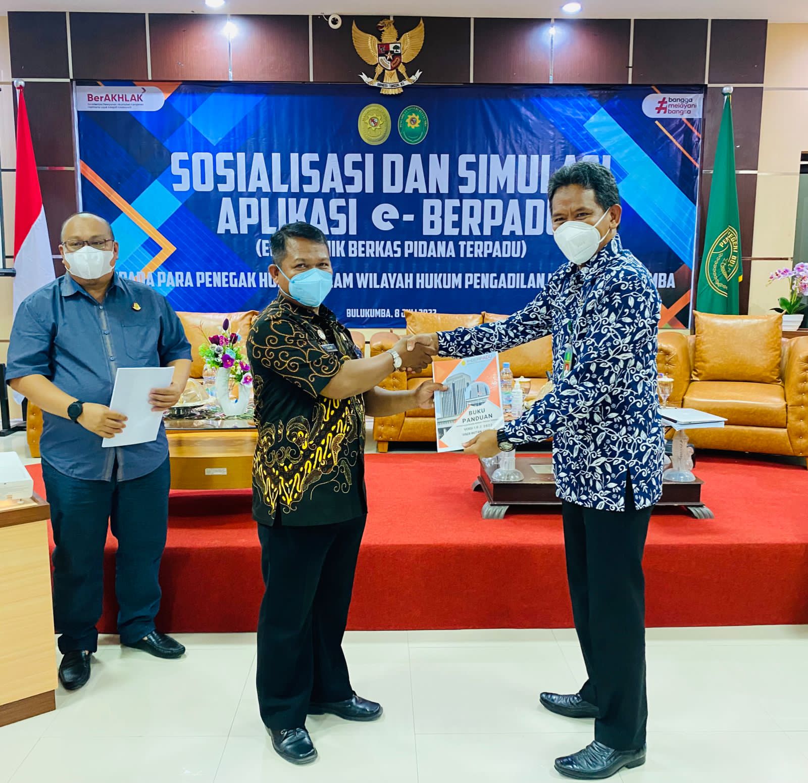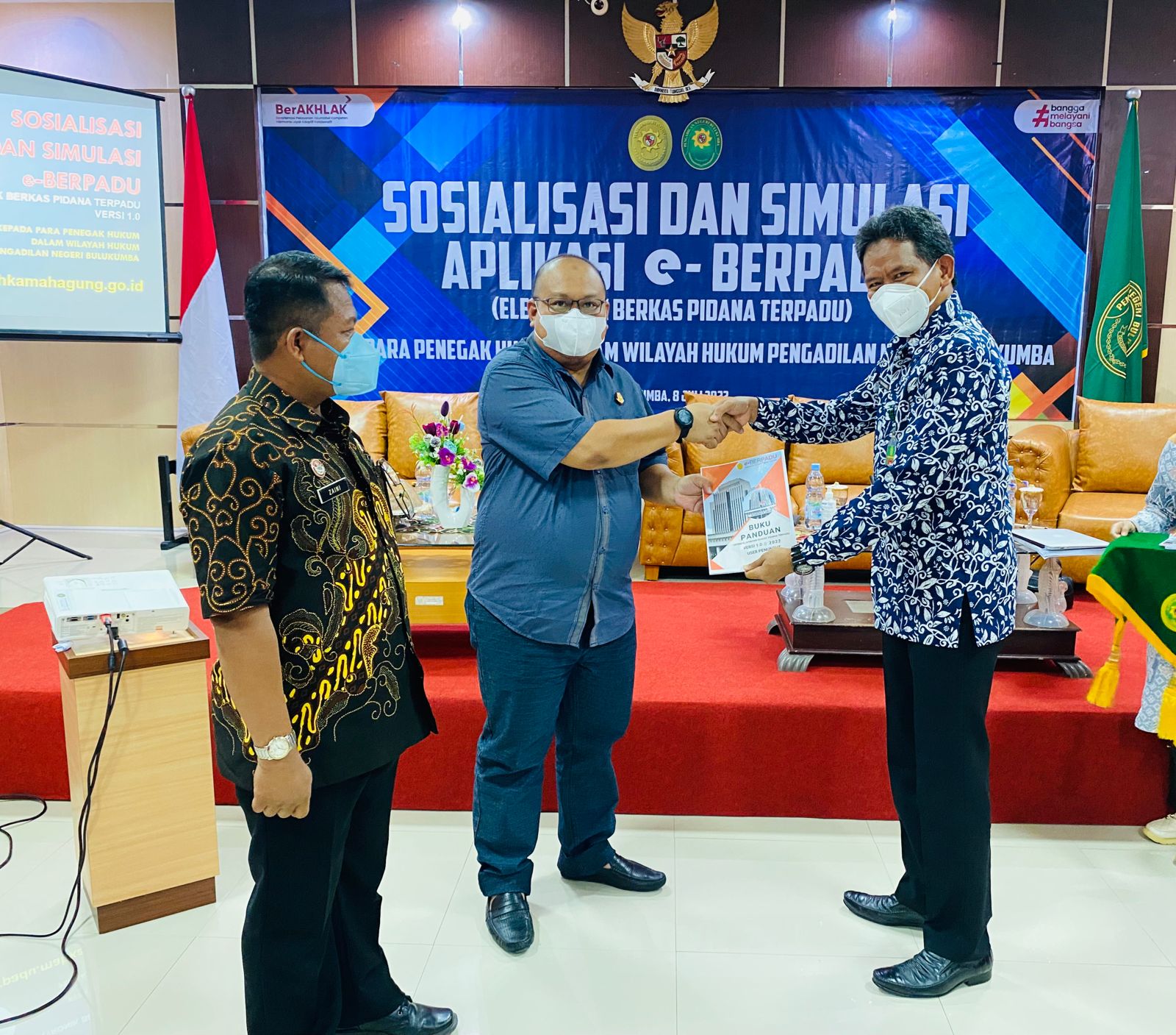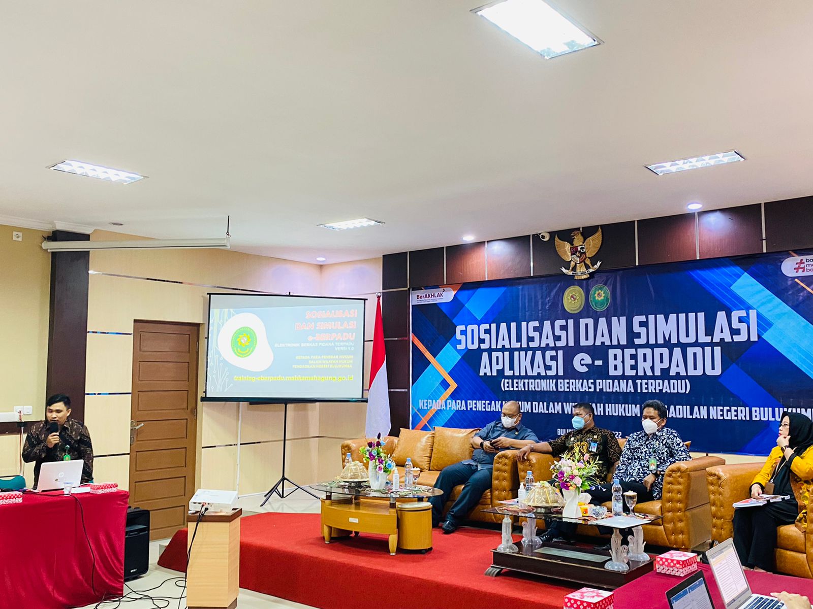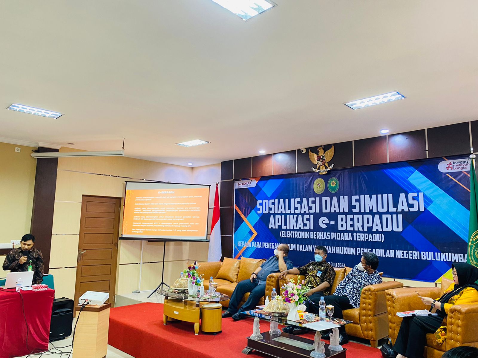 Bulukumba, Jumat 08 Juli 2022. Bertempat di ruang sidang utama Pengadilan Negeri Bulukumba, dilaksanakan Sosialisasi dan Simulasi Aplikasi Eletronik Berkas Perkara Terpadu (e-Berpadu) yang di buka langsung oleh Ketua Pengadilan Negeri Bulukumba, Bapak Dr. Muhammad Adil Kasim, S.H., M.H. yang di hadiri oleh Kepala Kajaksaan Negeri Bulukumba, Kepala Lembaga Pemasyarakatan Kelas IIA Bulukumba, Wakil Ketua Pengadilan Negeri Bulukumba, dan Perwakilan Kapolres Bulukumba. Peserta Kegiatan ini adalah Para Hakim, Penyidik Polres Bulukumba, Kasi dan Penuntut Umum Kejaksaan Negeri Bulukumba, Operator Lapas, Kapolsek Se - Kab.Bulukumba dan seluruh Aparatur Pegawai Negeri Sipil Pengadilan Negeri Bulukumba.