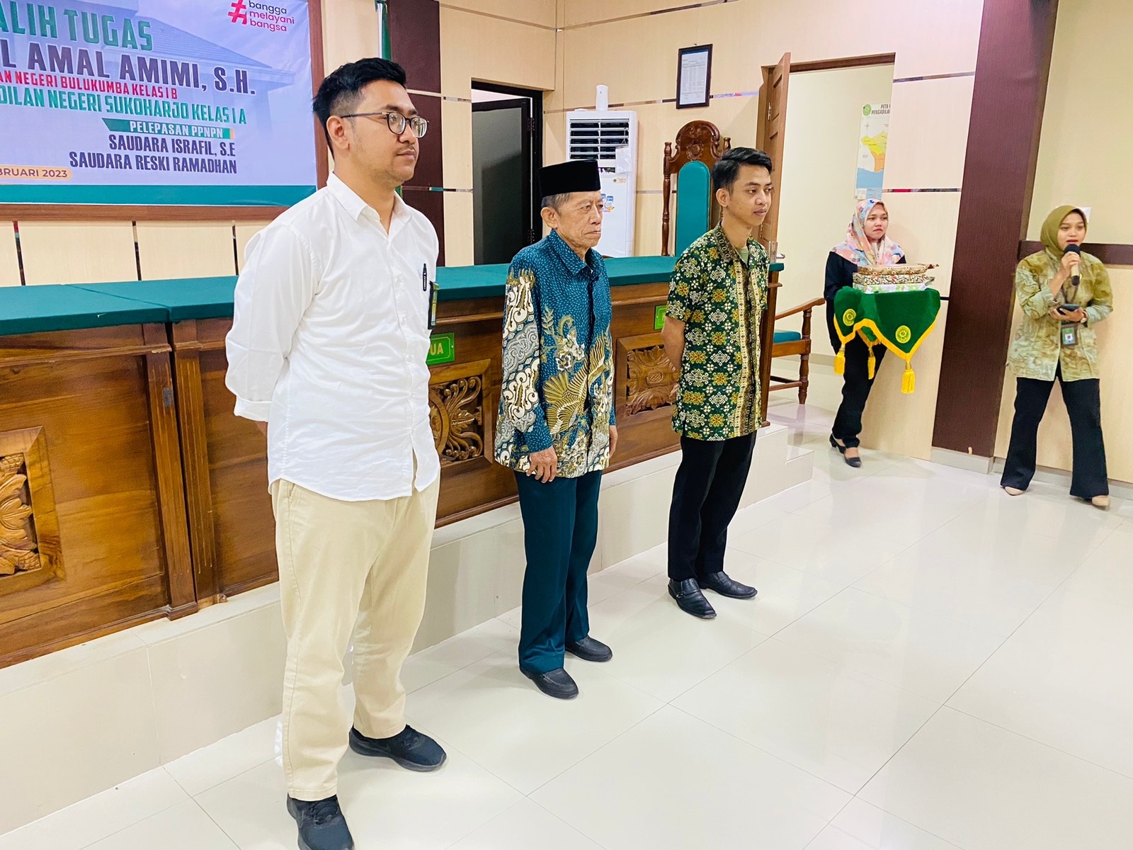 Bulukumba Jum'at 10 Februari 2023. Bertempat di ruang sidang utama. Kegiatan pengantar Alih tugas Bapak Muhammad Ichlasul Amal Amimi, S.H. (Analis SDM Aparatur Pengadilan Negeri Bulukumba Kelas IB) menjadi Analis Tata Laksana Pengadilan Negeri Sukoharjo Kelas IA dan phurnabakti Pegawai Bapak Abd. Halik S.H. dan Bapak Syahiruddin serta Pelepasan PPNPN Saudara Israfil S.E. dan Saudara Reski Ramadhan. Yang dihadiri oleh keluarga besar Pengadilan Negeri Bulukumba Kelas IB. Dalam sambutannya Ketua Pengadilan Negeri Bulukumba Bapak Dr. Muhammad Adil Kasim, SH. MH. menyampaikan agar selalu menjaga hubungan silaturahmi satu sama lain walaupun sudah berada di tempat yang baru, dan semoga di tempat yang baru dapat bekerja lebih baik lagi.