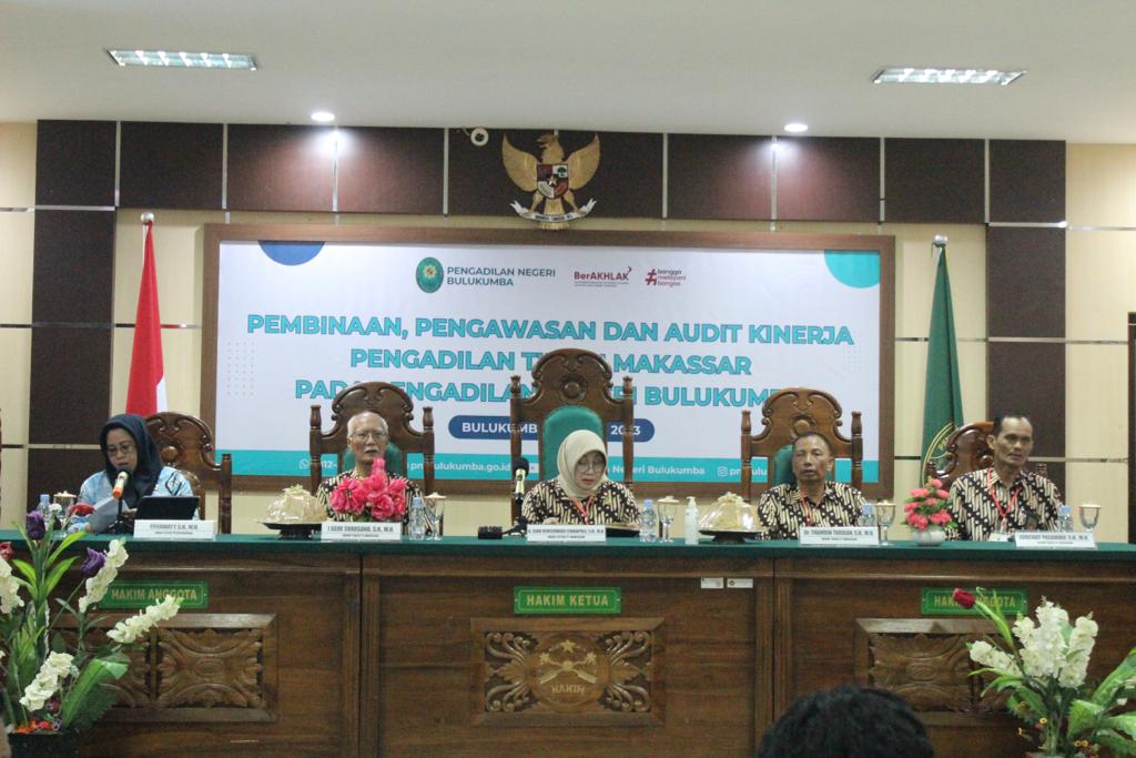 Kamis, 11 Mei 2023. Bertempat di Ruang Sidang Utama Pengadilan Negeri Bulukumba telah dilaksanakan Opening Meeting Pembinaan, Pengawasan dan Audit Konerja Pengadilan Tinggi Makassar Pada Pengadilan Negeri Bulukumba. Pelaksanaan dipimpin oleh Wakil Ketua Pengadilan Tinggi Makassar Ibu Andi Isna Cindrapole, S.H. M.H. beserta tim audit kinerja yang dihadiri oleh Wakil Ketua Pengadilan Negeri Bulukumba Ibu Ernawaty, S.H. M.H. dan Para Hakim, Panitera, Sekretaris dan seluruh Aparatur Pegawai Pengadilan Negeri Bulukumba. Kegiatan berlangsung dengan lancar dan tertib.
