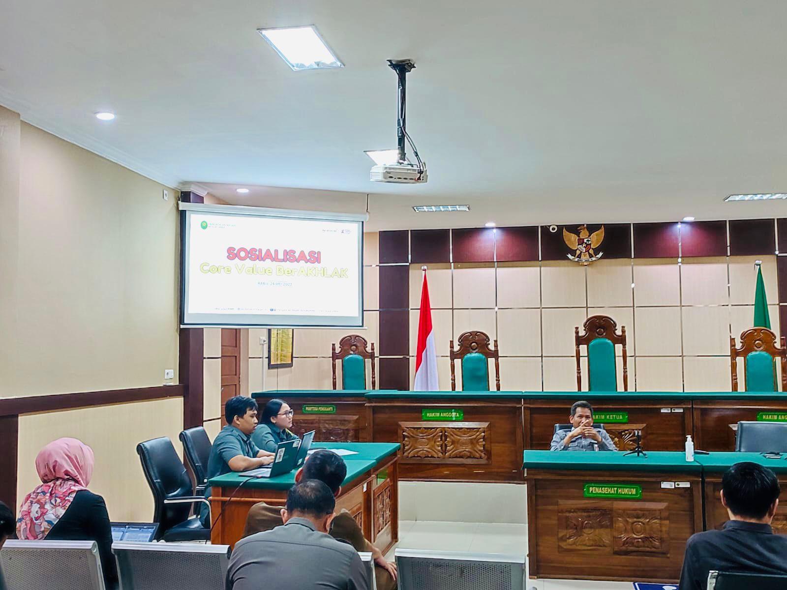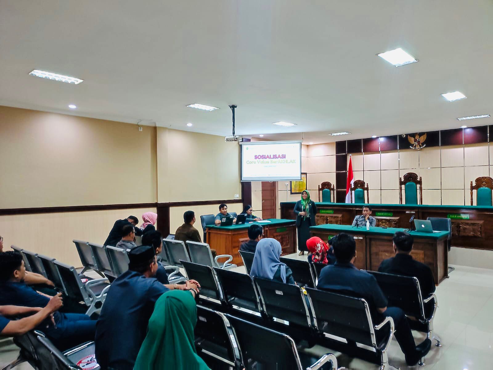 Bulukumba, Rabu 24 Mei 2023. Bertempat di Ruang Sidang Utama Pengadilan Negeri Bulukumba telah dilaksanakan sosialisasi Implementasi Core Value ASN BerAKHLAK. Wakil Ketua PN Bulukumba Ibu Ernawaty, S.H., M.H. selau pembawa materi dalam sosialisasi tersebt yang diikuti oleh Ketua Pengadilan Negeri Bulukumba Bapak Dr. Muhammad Adil Kasim, S.H., M.H. dan Para Hakim, Panitera, Sekretaris dan seluruh Aparatur Pegawai Pengadilan Negeri Bulukumba