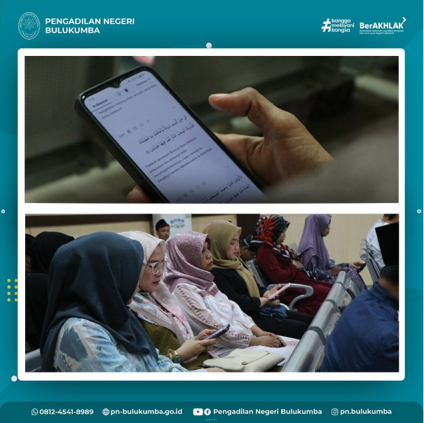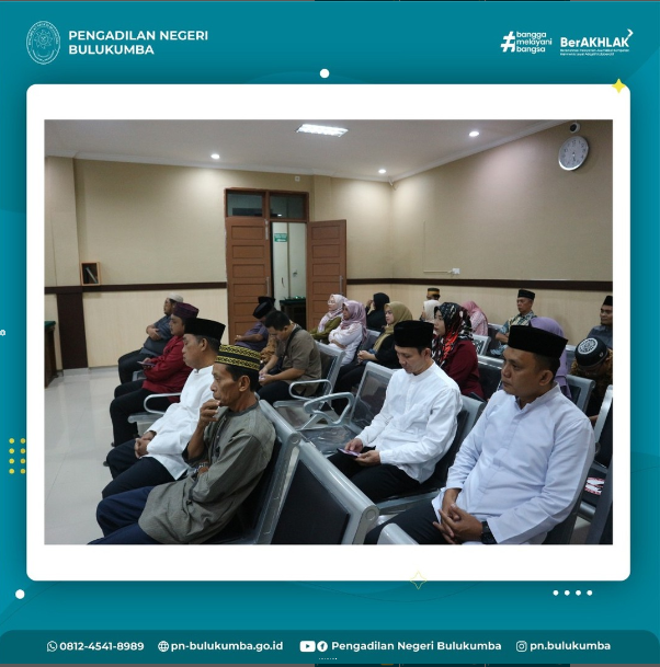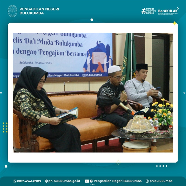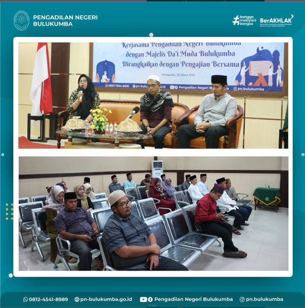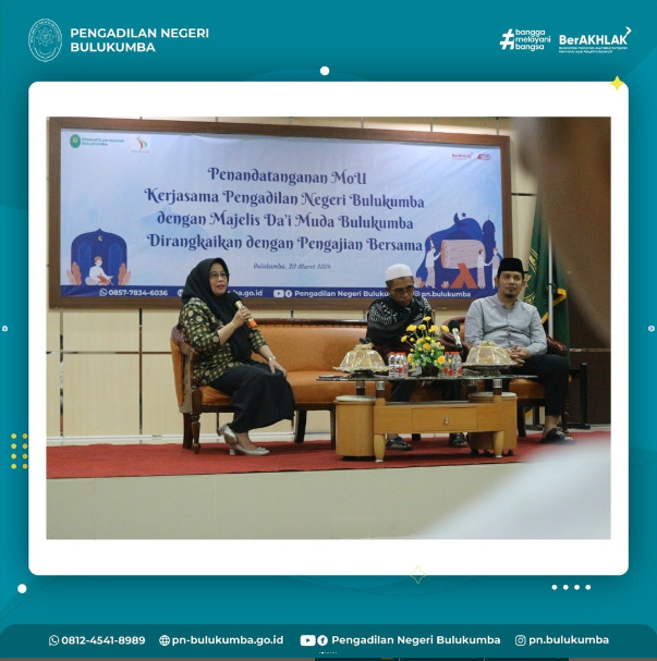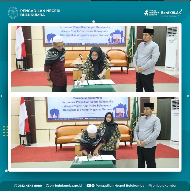 bertempat di Kantor Pengadilan Negeri Bulukumba telah dilaksanakan penandatanganan MOU kerjasama Pengadilan Negeri Bulukumba dengan Majelis Da’i Muda Bulukumba dirangkaikan dengan Pengajian dan Buka bersama. Acara dibuka oleh Ketua Pengadilan Negeri Bulukumba Ibu Ernawaty, S.H., M.H. kemudian dilanjutkan dengan Tausyiah oleh Bapak Ust. Dr. Ikhwan Bahar, S.Pd.I., M.Pd. Ketua Majelis Da’i Muda Pusat Bulukumba. Acara ini diikuti oleh Wakil Ketua, para Hakim, Panitera, Sekretaris, Dharmayukti Karini Bulukumba dan seluruh Aparatur pegawai Pengadilan Negeri Bulukumba.