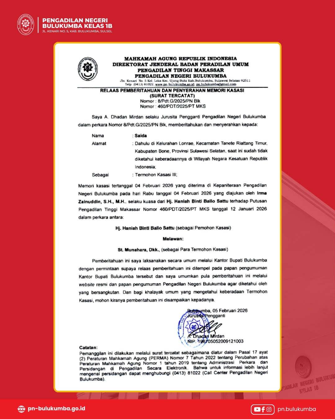 Pengadilan Negeri Bulukumba menyampaikan pemberitahuan secara umum terkait permohonan kasasi dalam perkara perdata: