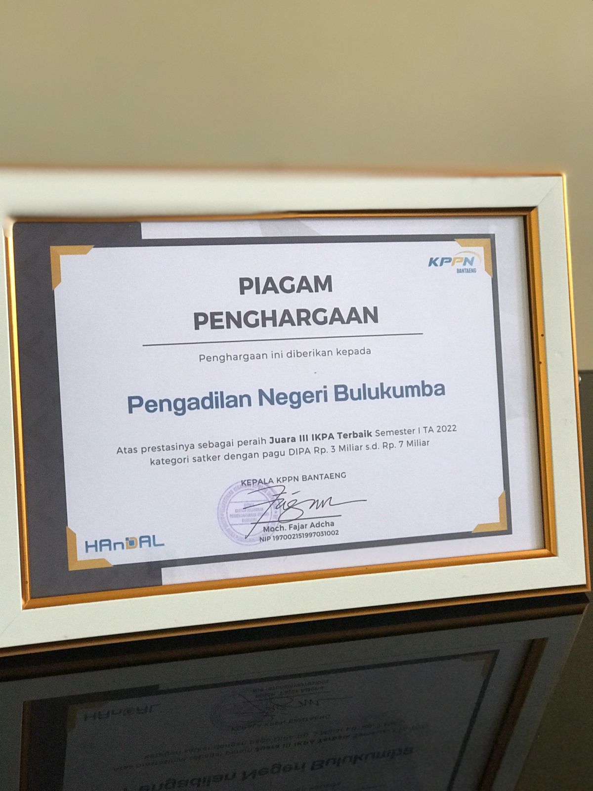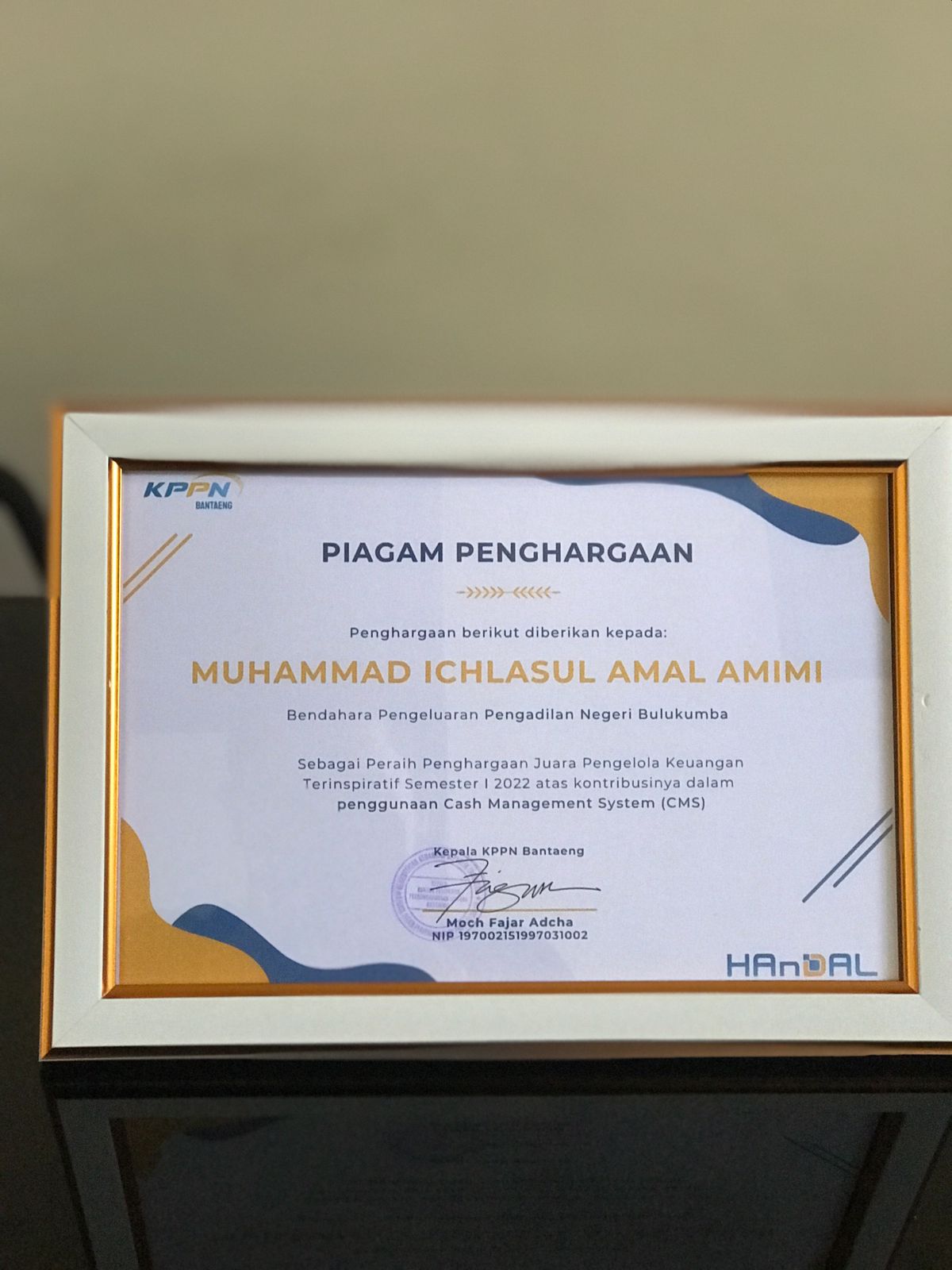 Sekretaris selaku Kuasa Pengguna Anggaran Bp. Yulius Simon, S.E., M.M menerma kunjungan silaturahmi Kepala KPPN Bantaeng Bp. Moch Fajar Adca S.E., M.Si. Dalam Kunjungan ini Kepala KPPN Bantaeng menyerahkan Piagam Penghargaan Satuan Kerja Terbaik Lingkup KPPN Bantaeng Semester 1 TA.2022 dan Piagam Penghargaan Juara Pengelola Keuangan Terinspiratif Semester 1 TA.2022 Kepada Bendahara Muhammad Ichlasul Amal Amimi, S.H.